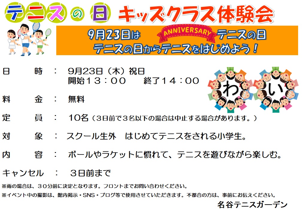 9/23(木)はテニスの日 「キッズ」「親子」W体験会開催!
