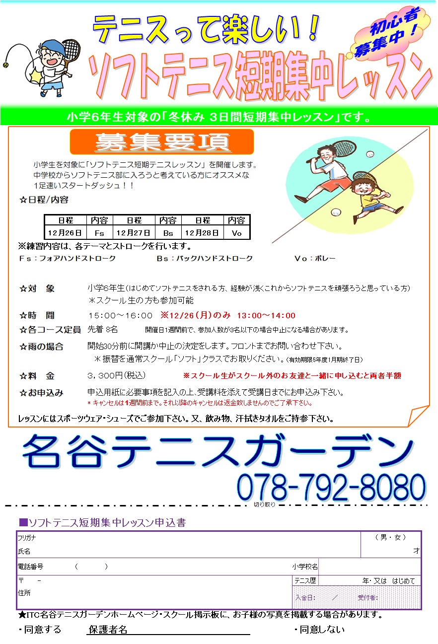 12/26(月)~12/28(水)に名谷テニスガーデンで「冬休みソフトテニス短期集中レッスン」を開講します。