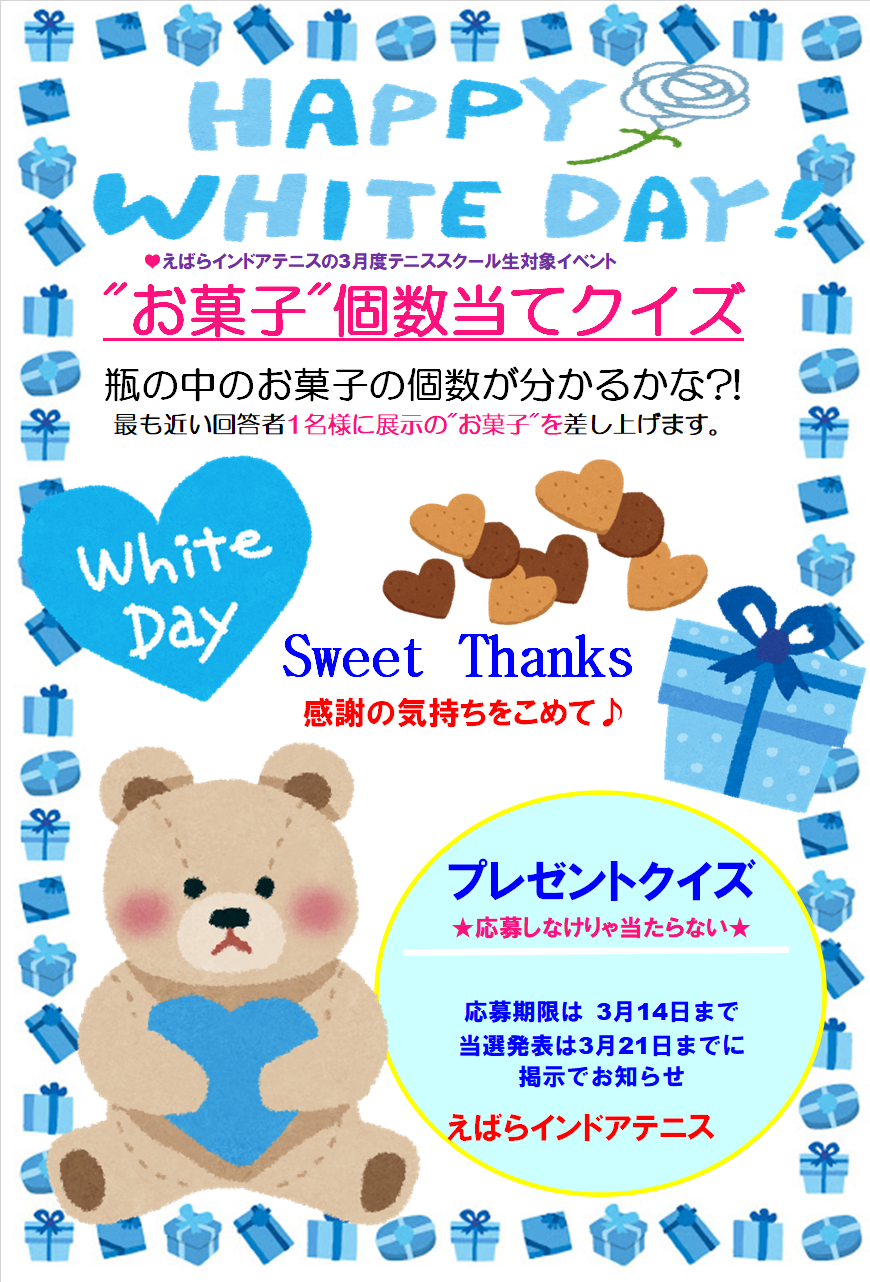 えばらインドアテニスで【ホワイトデークイズ】を開催中です!!