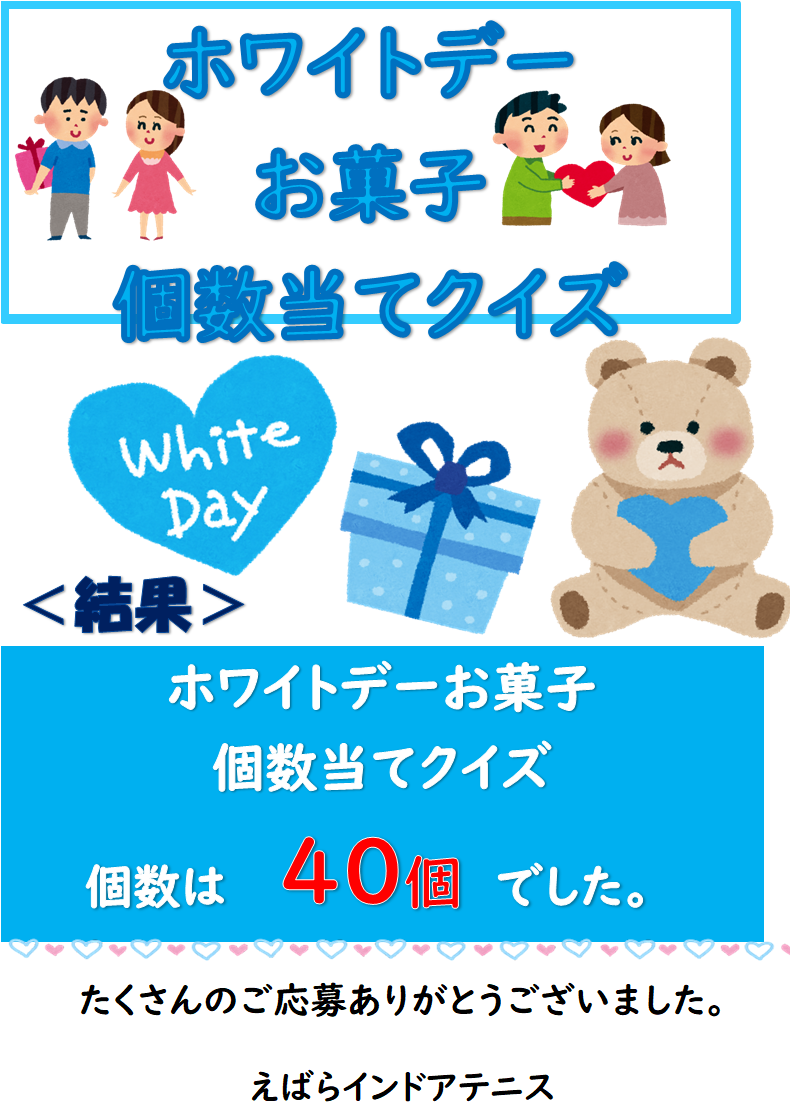 来月はホワイトデークイズクッキーの個数当てクイズを開催致しますのでたくさんの参加お待ちしております。