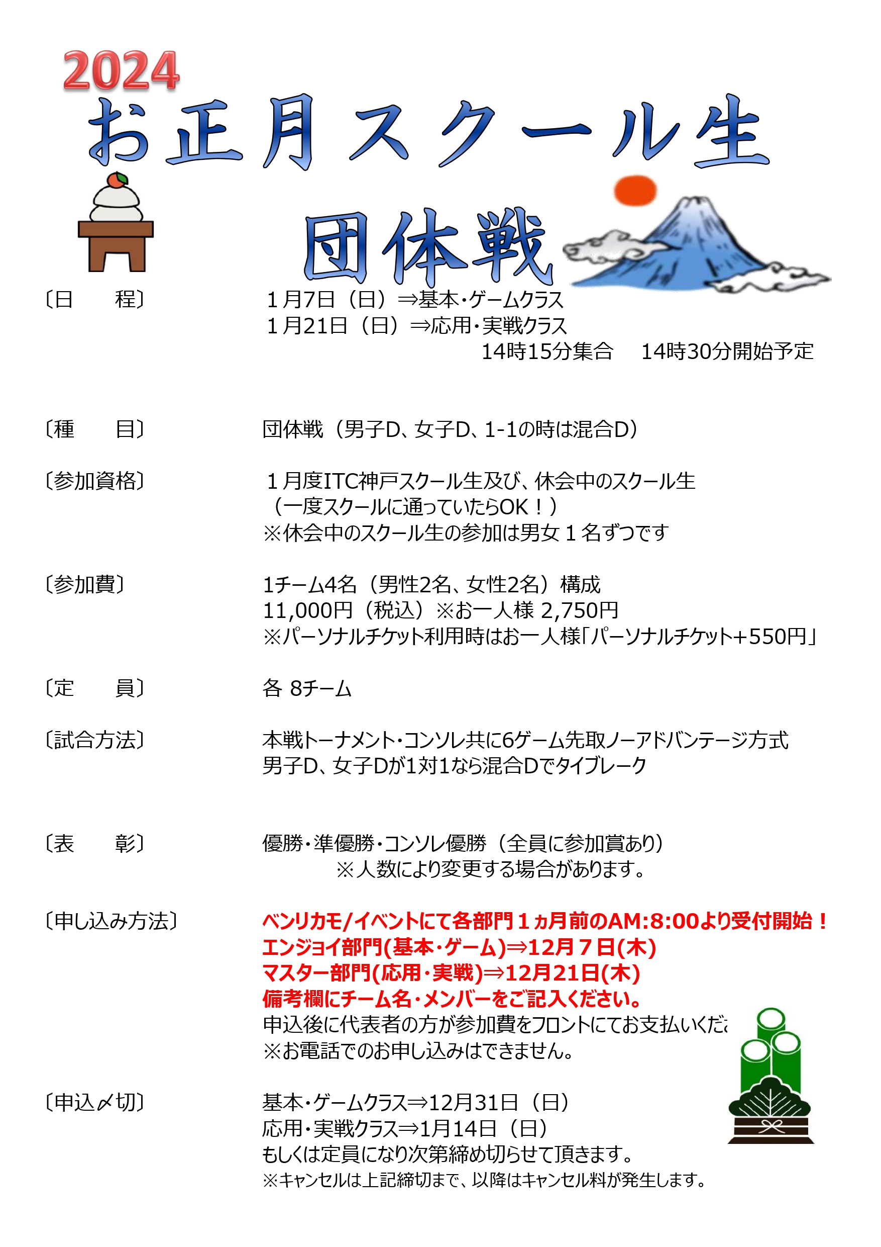 2024年1月度に開催予定のお正月団体戦の参加定員に誤りがありました。