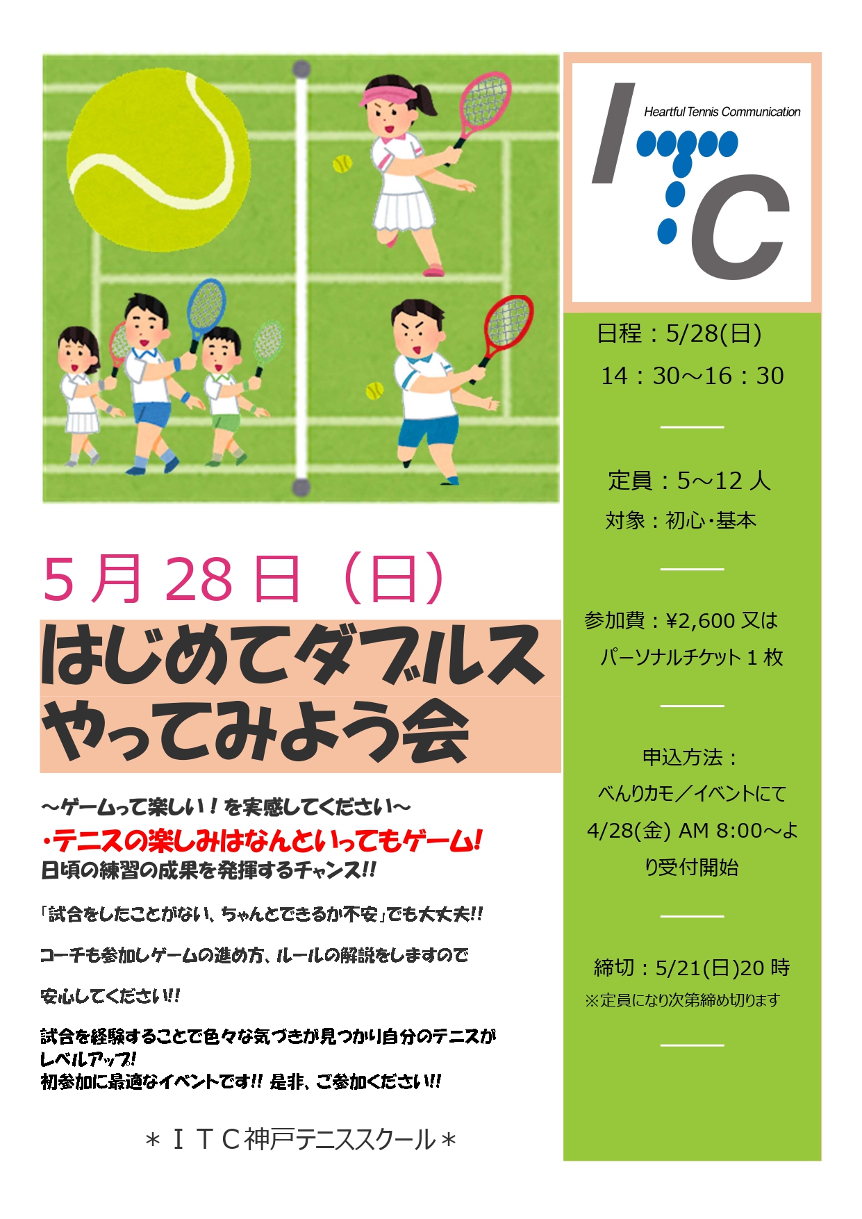 初心、基本クラス対象で、ダブルス少しやってみたいなと思う方は!是非ご参加ください。