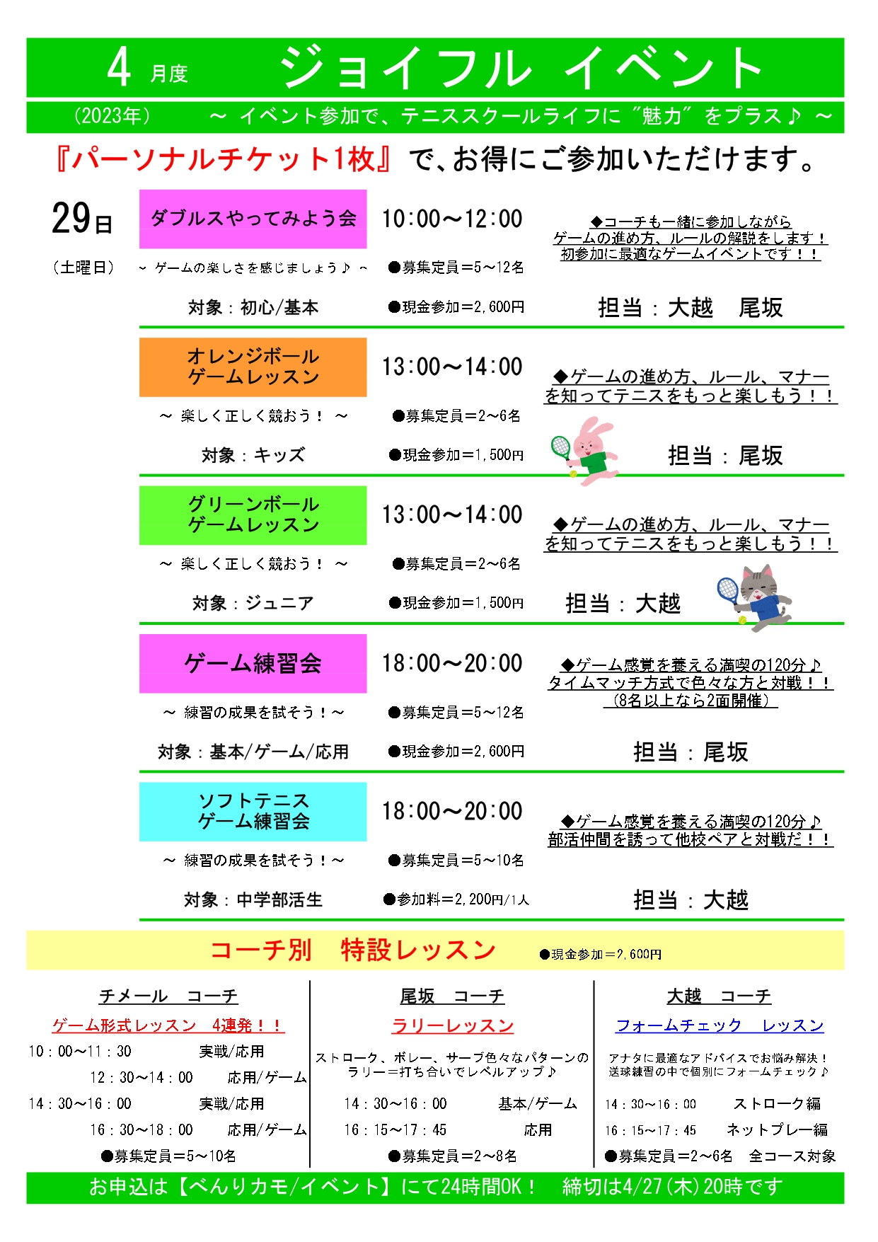 今月の通常レッスンは4/27(木)まで!