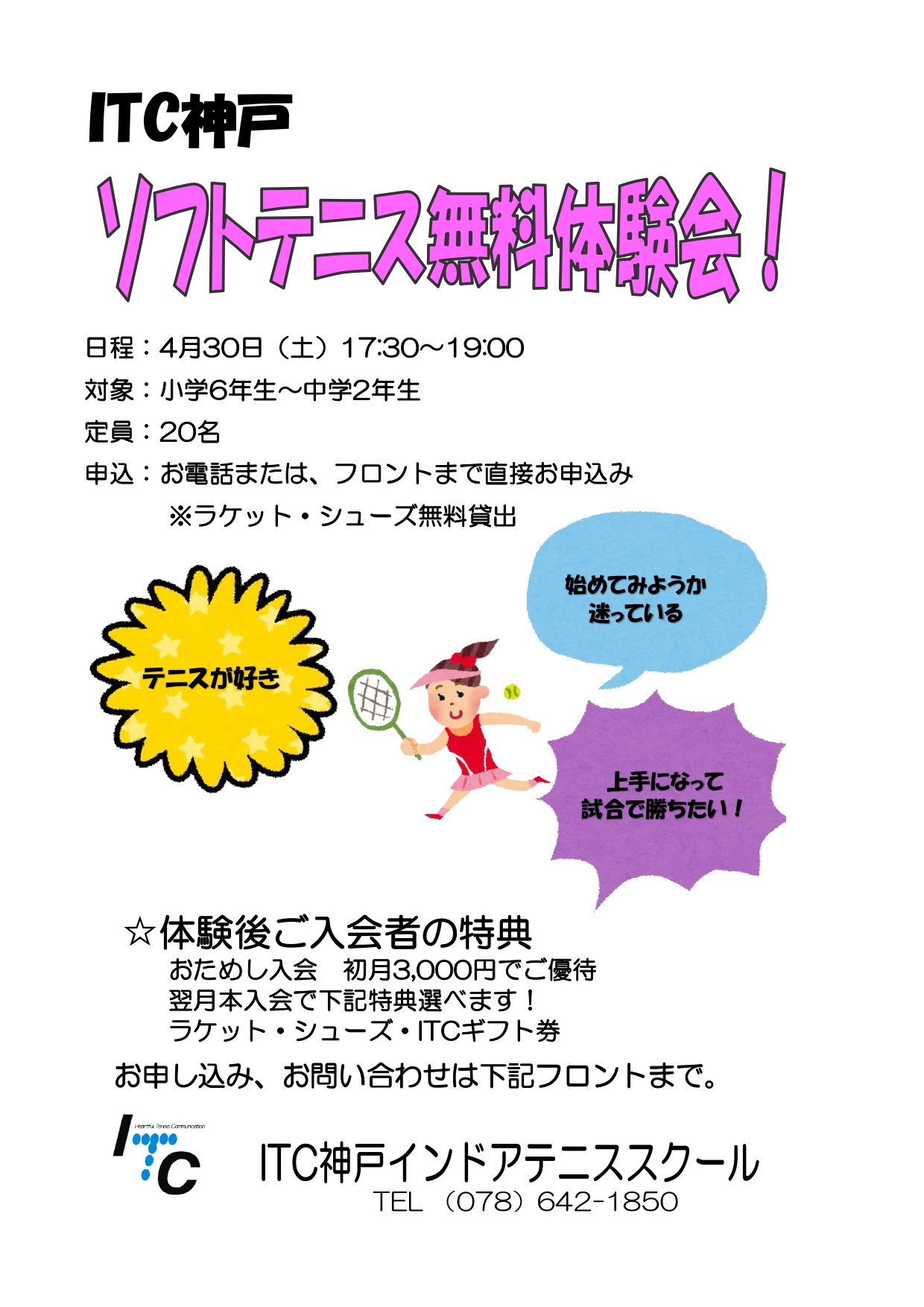 ITC神戸でソフトテニスの体験会&ゲーム練習会を行います