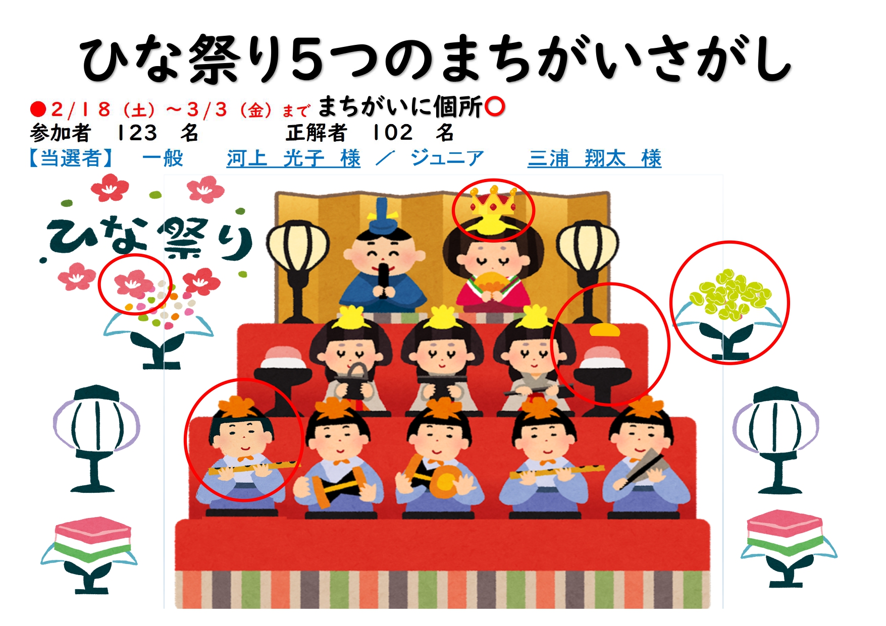 今回は、3/3まで開催しておりましたひなまつり間違い探し!
