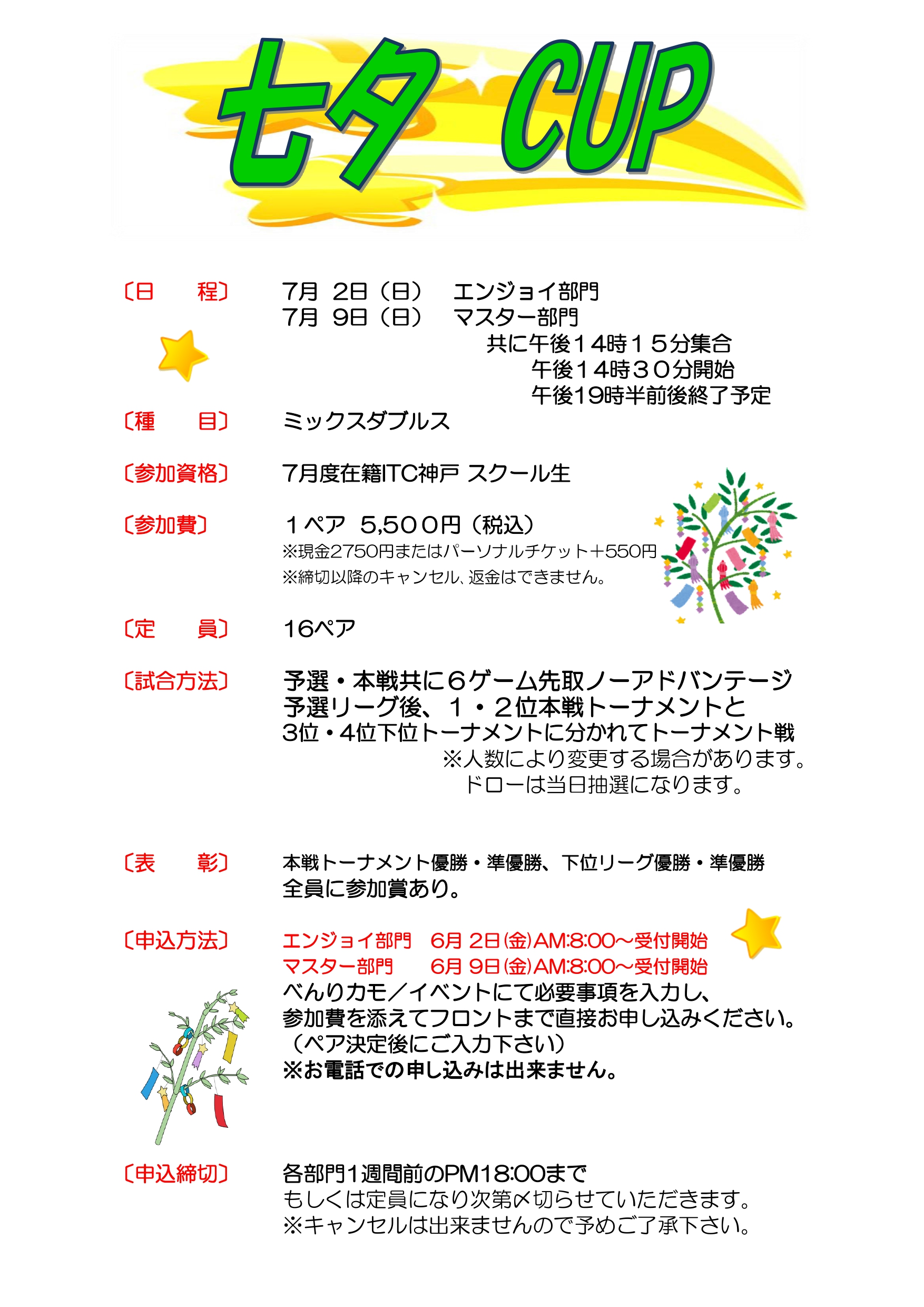 7月9日(日) 七夕カップMIXダブルス マスター部門 を開催予定です。