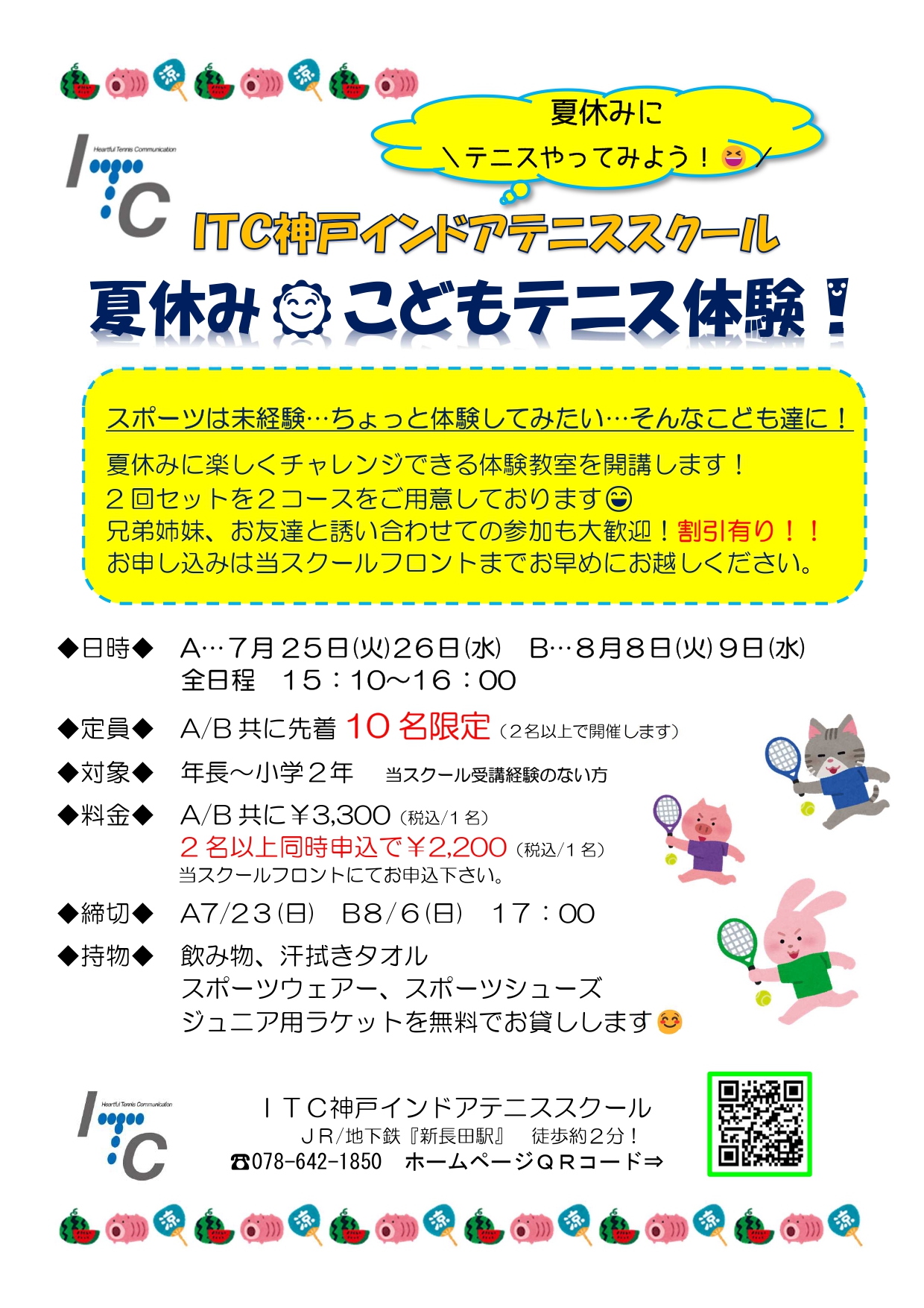 今回は、夏休みに開催される「夏休みこどもテニス教室」のご案内です
