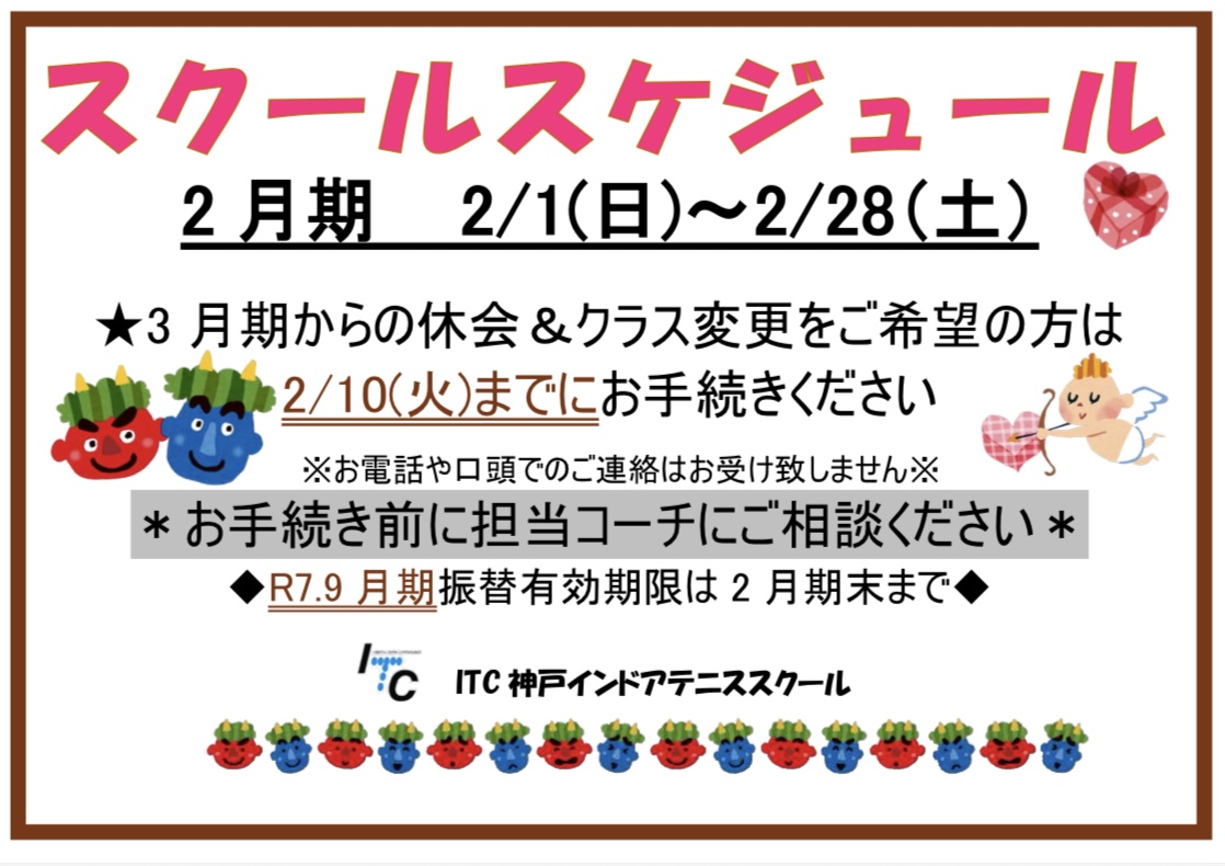2月期のスクールスケジュール・クラス表について、下記の通りご案内いたします。