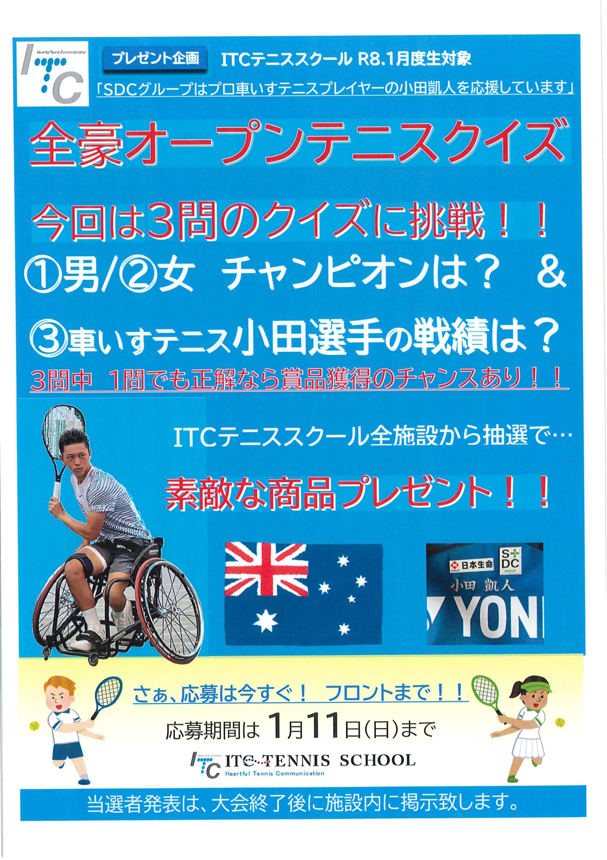 1/11(日)まで全豪オープンテニスクイズ、優勝当てクイズを行っています。