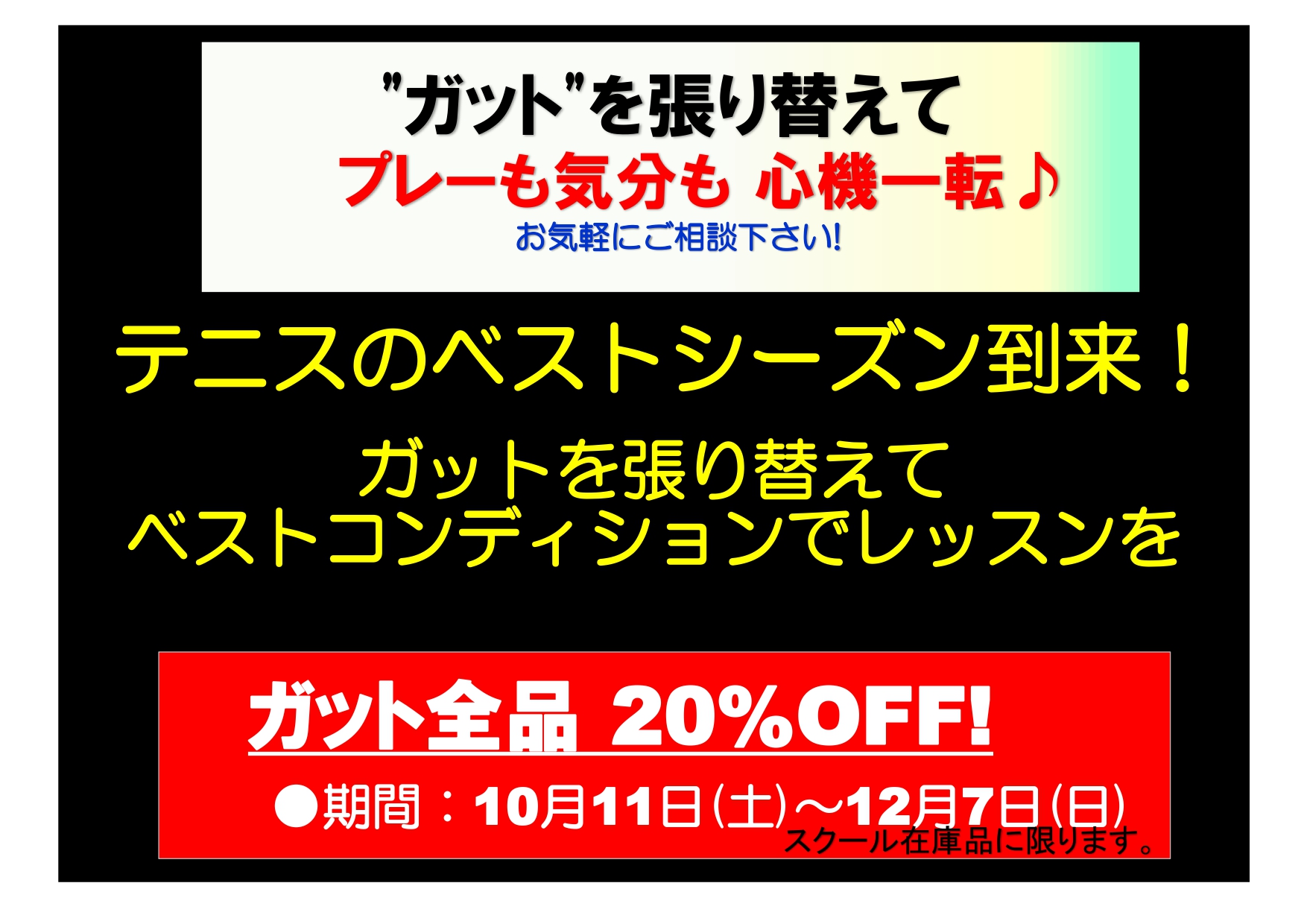 年内最後の【ラケット・ガット張替キャンペーン】が11日(土)からスタートします