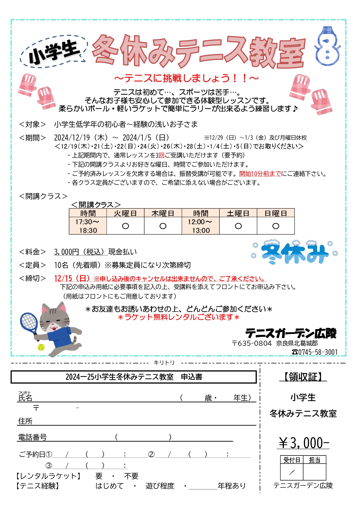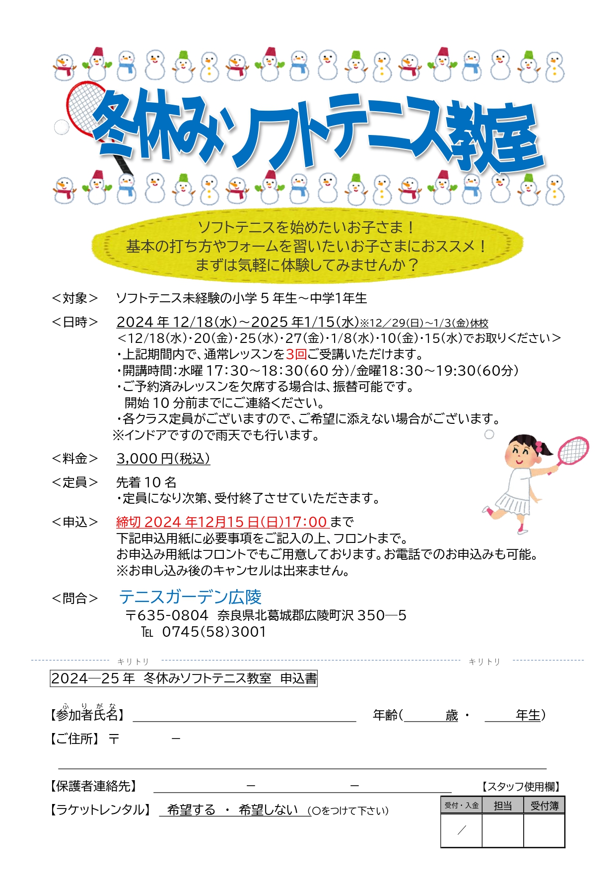 テニスガーデン広陵では、冬やすみ期間中にに下記の内容で「短期教室」を開催します。