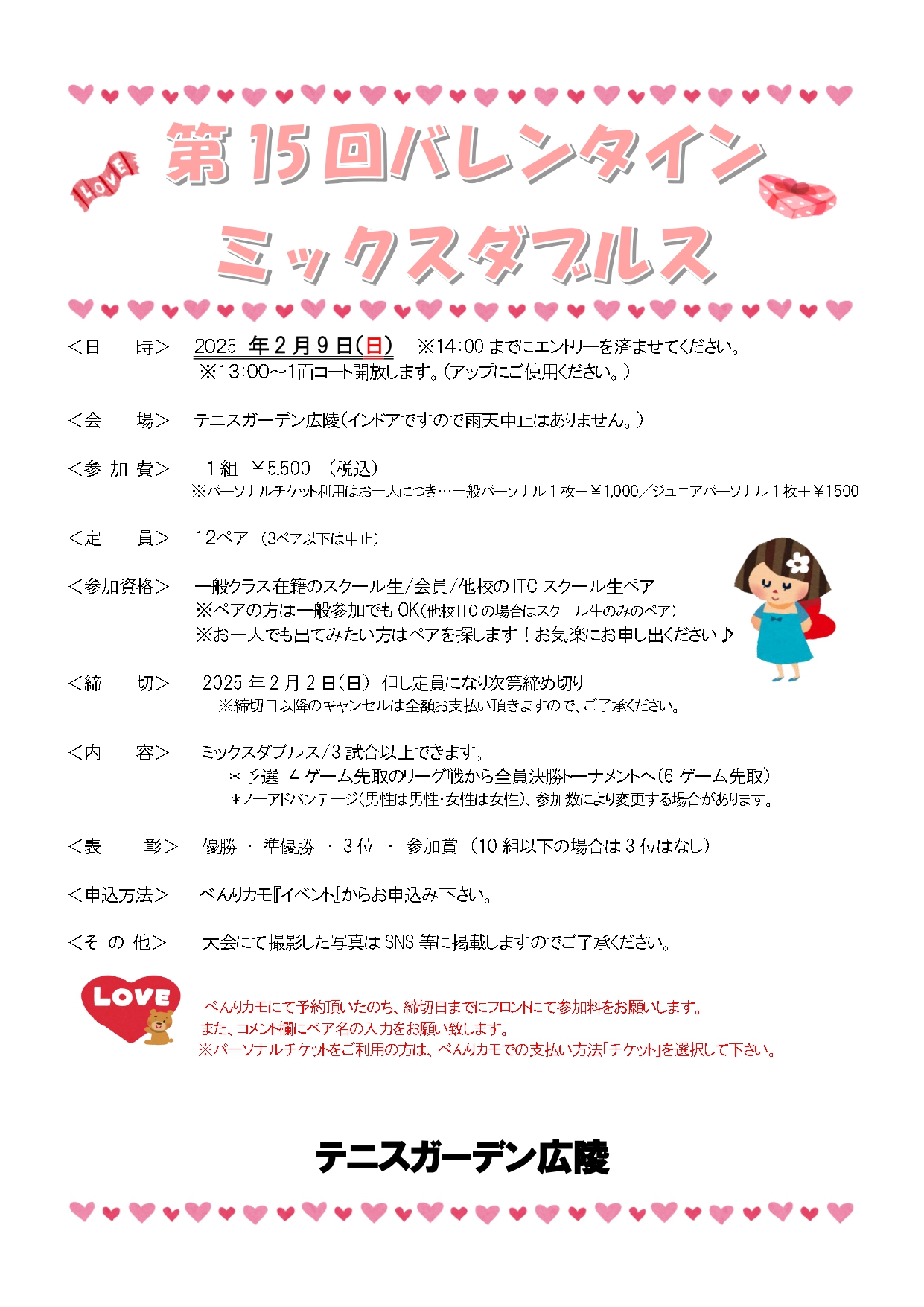 恒例の【バレンタインミックスダブルス】大会募集中!