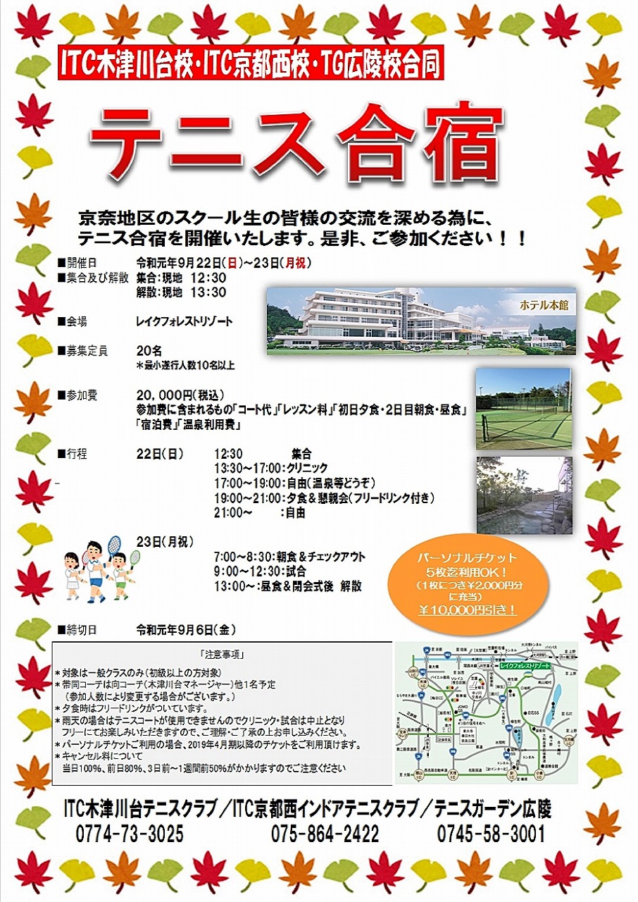 今年の秋、テニスガーデン広陵で「テニス合宿」を行います。