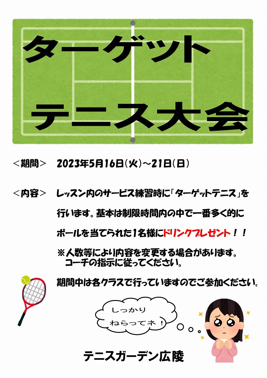 レッスンのサーブ練習時に行いますが、各クラスで一番多く的にサーブを当てられた方1名様にジュースプレゼント