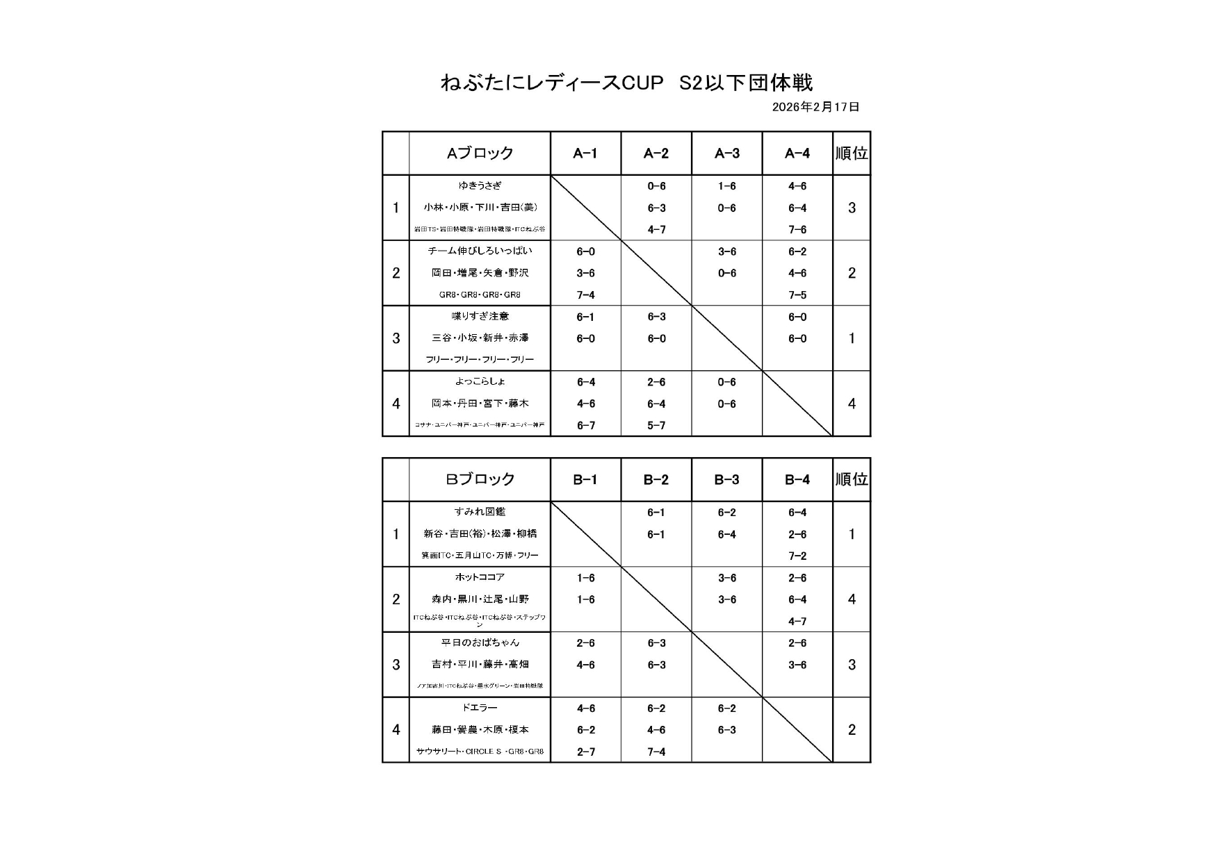 2/17(火)ねぶ谷レディースカップS2以下団体戦を開催しました