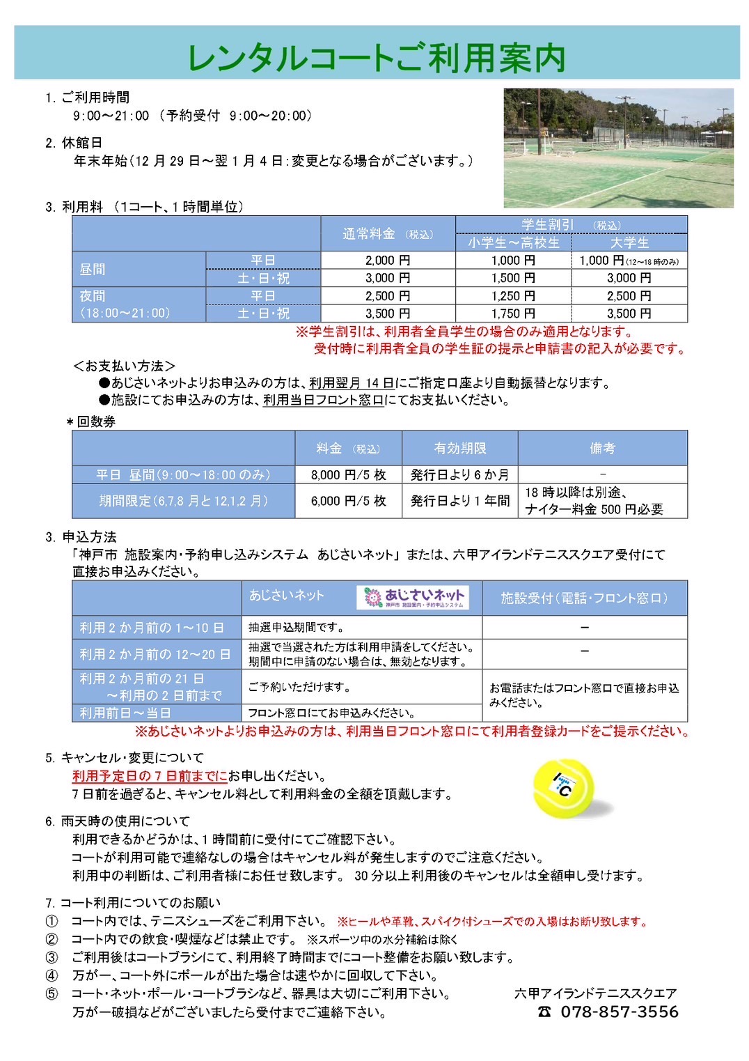 また、上記期間中のレッスンに関しましても、雨などでコートが暗くプレーが難しい場合、中止とさせていただきます。