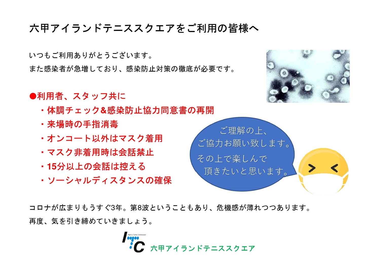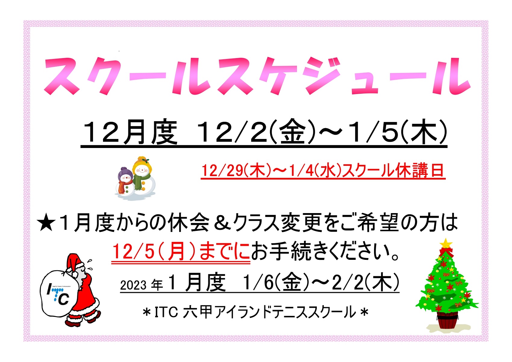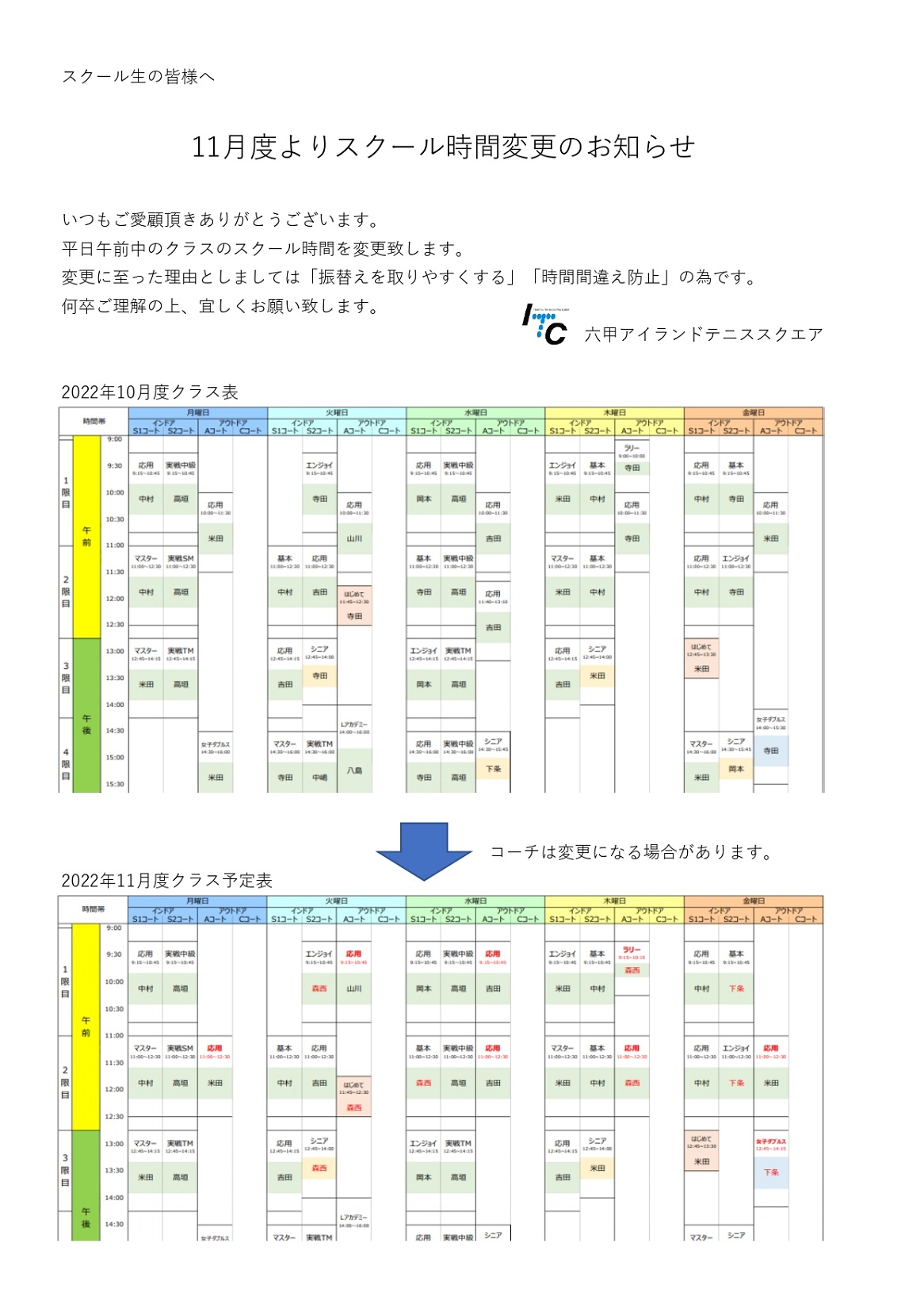 急な決定となり申し訳ございません。今後ともITC六甲アイランドテニススクエアを宜しくお願い申し上げます。