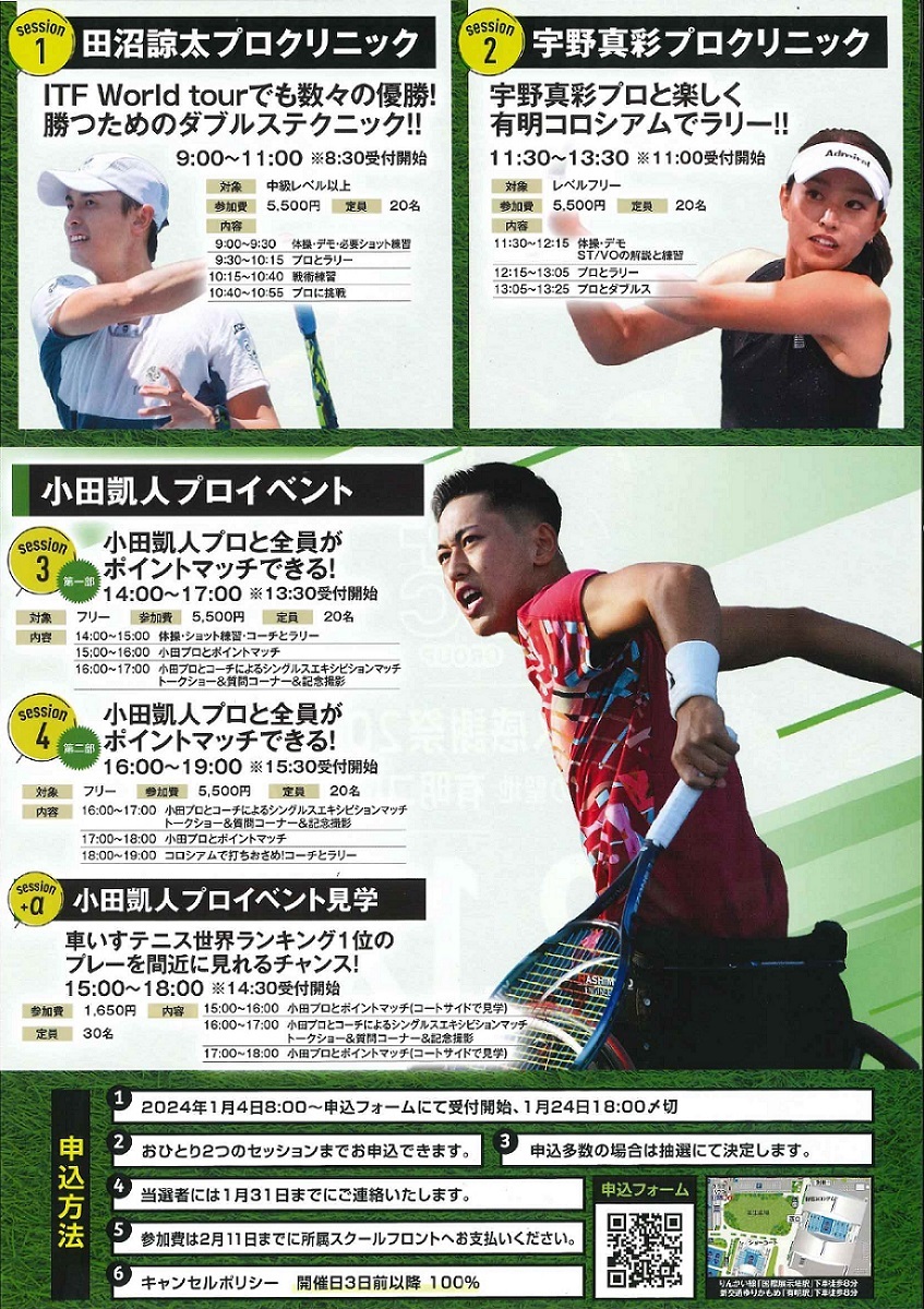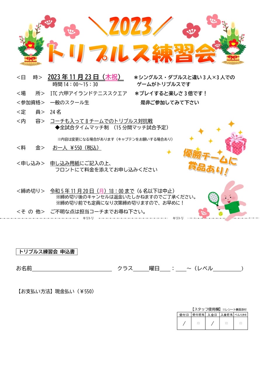 12,1月特別スクール生イベント募集中です!主にダブルス練習会などのイベントがあり、中学生対象のソフトテニスのダブルス練習会もございます!