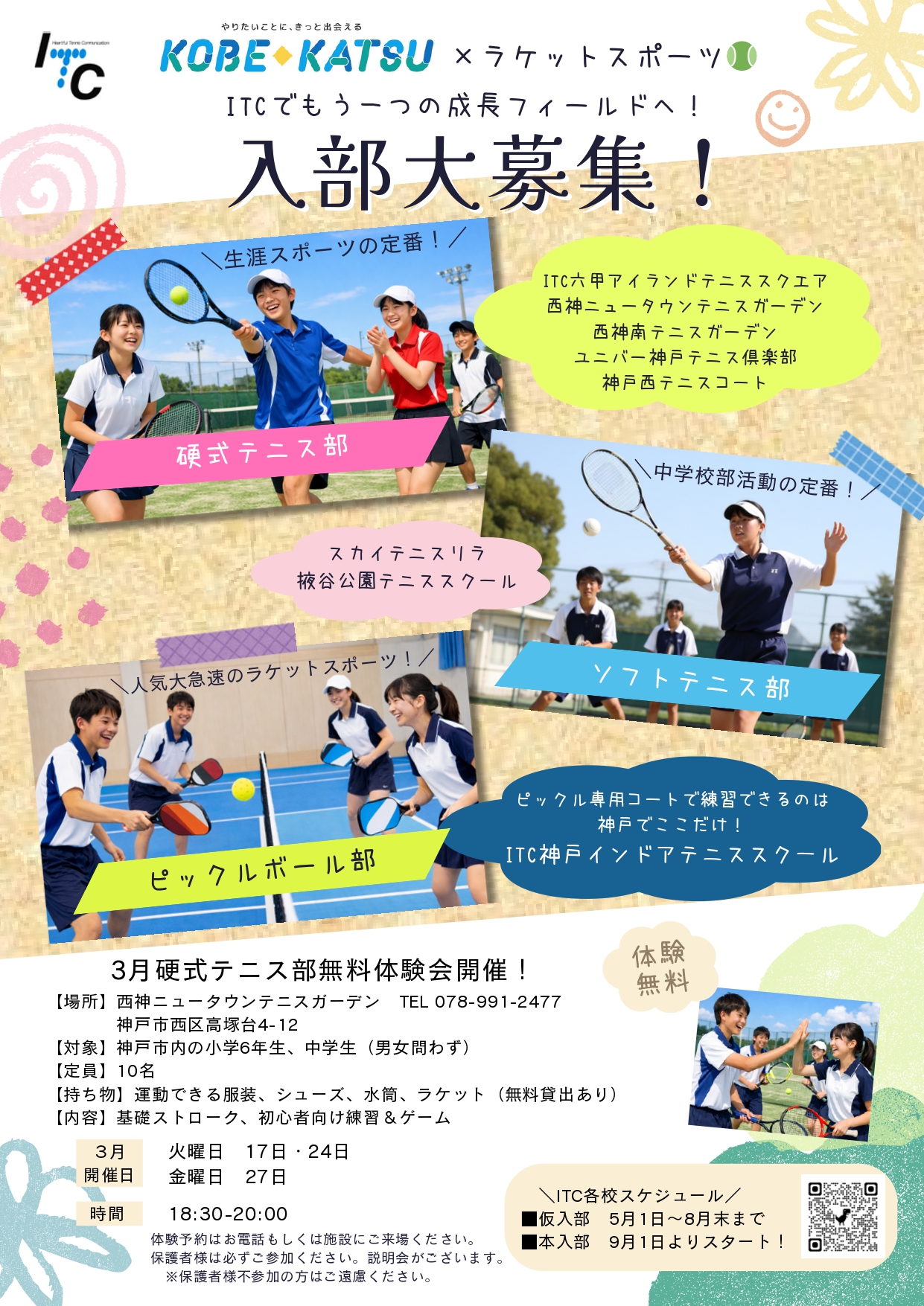 西神テニスガーデンでコベカツ3月硬式テニス無料体験会を開催します。