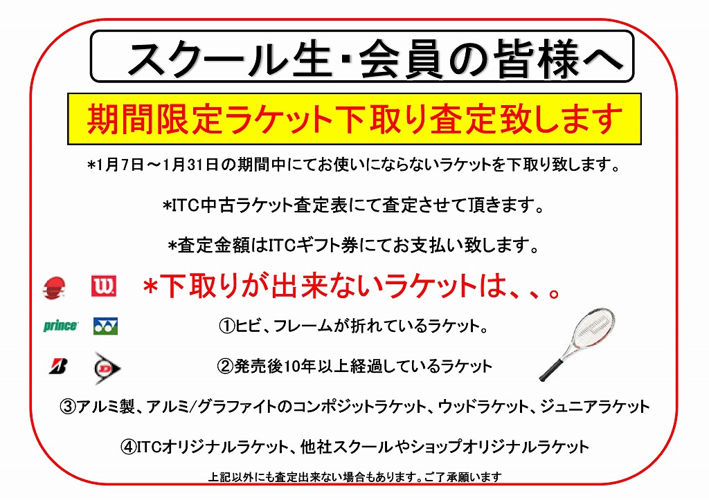 ITCテニススクールでは1月7日~31日の期間でお客様の使っていないラケットを