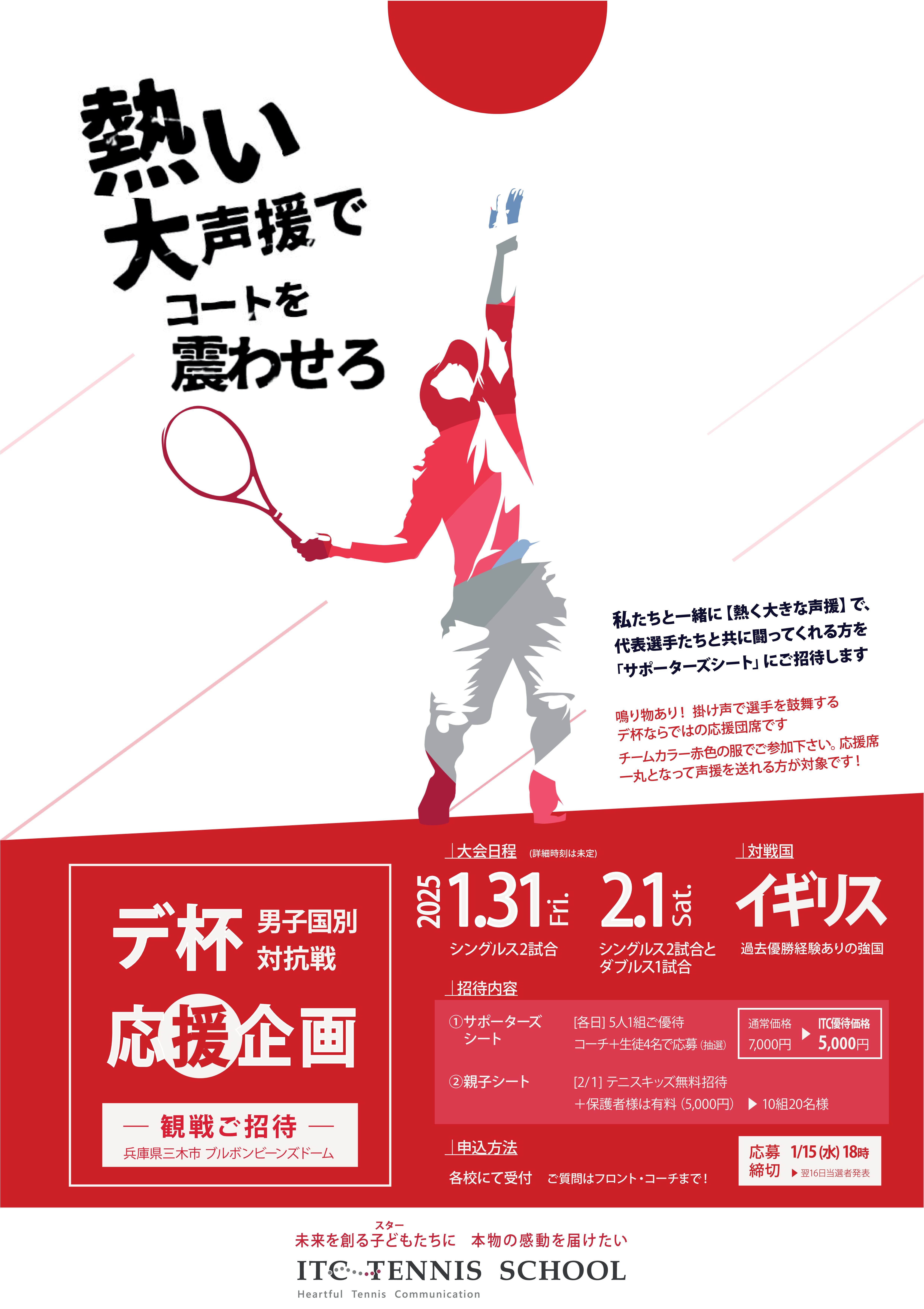 チケットは一般販売時には売切も予想される大会です。気の合うテニス仲間や親子で「デ杯」ならではの鳴り物や掛け声ありの大応援に参加しませんか🎾