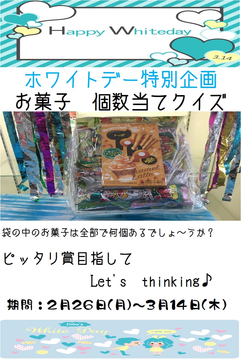 バレンタインデーに引き続き、ホワイトデーの個数当てクイズを行います。
