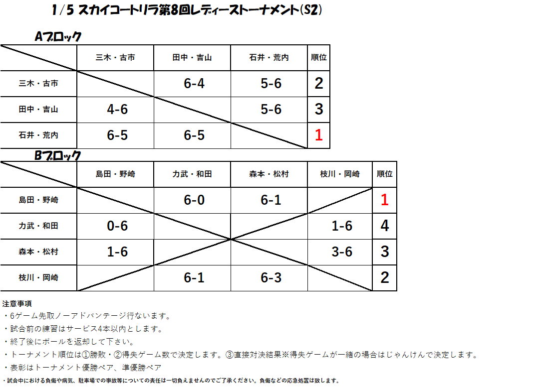 1月5日に行われましたレディーストーナメント(個人戦)の結果を掲載致します