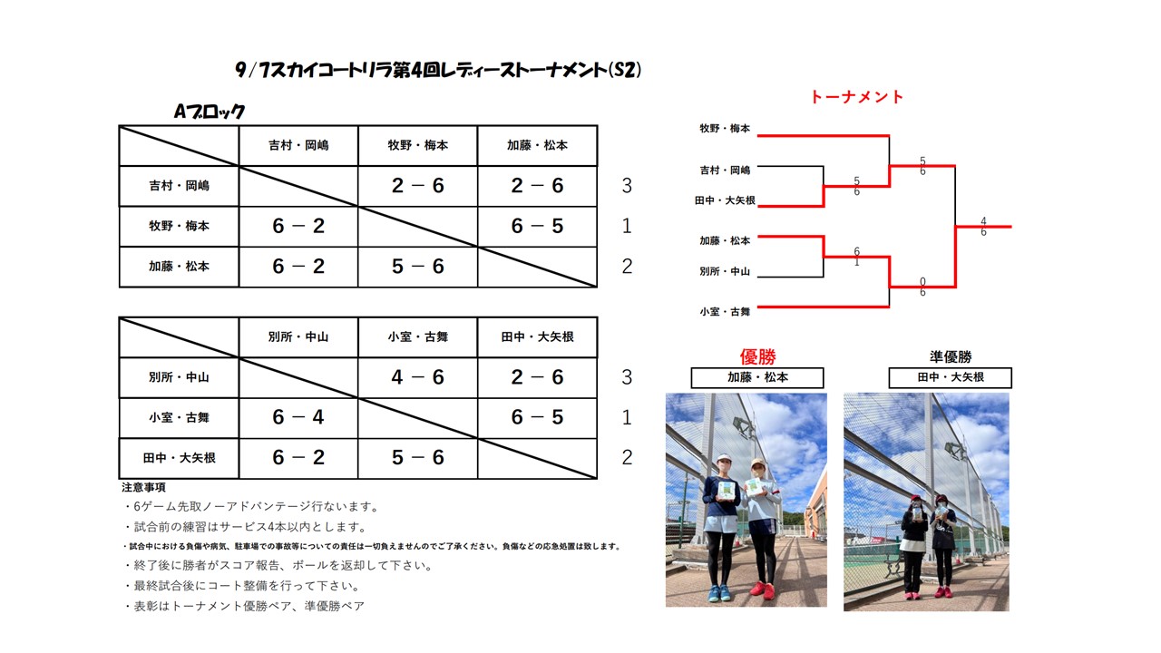 9月7日(水) スカイコートレディーストーナメント個人戦S2 結果