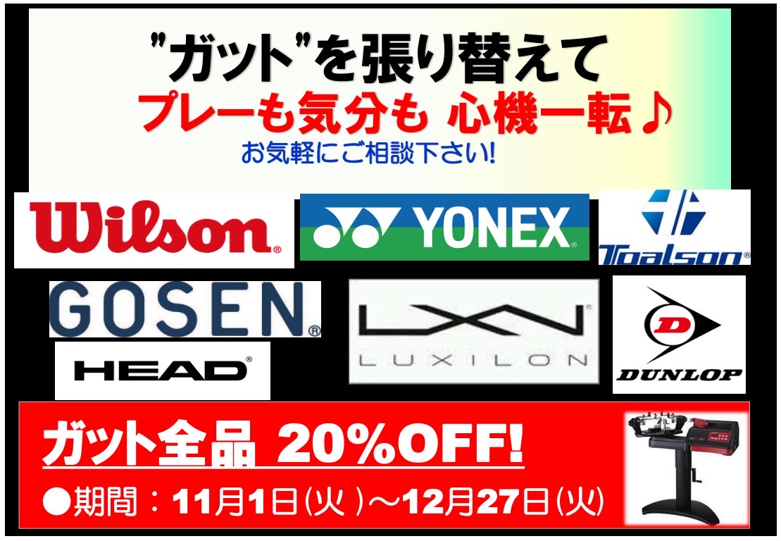 購入していただいたガットが全品20%OFFになるとてもお得なキャンペーンです
