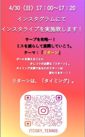 4月度もスカイテニスリラのインスタグラムアカウントにて、「インスタライブ」を配信致します♪