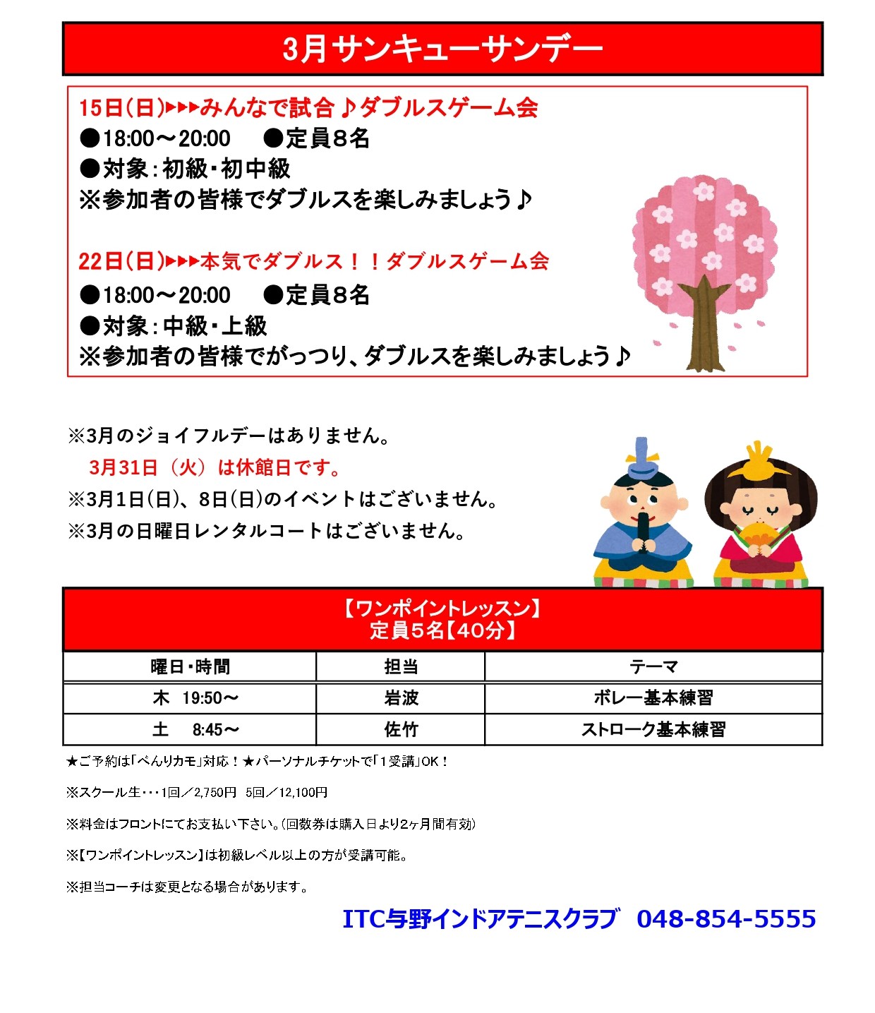3/29(日)~31(火)の5週目は通常レッスンはお休みとなります