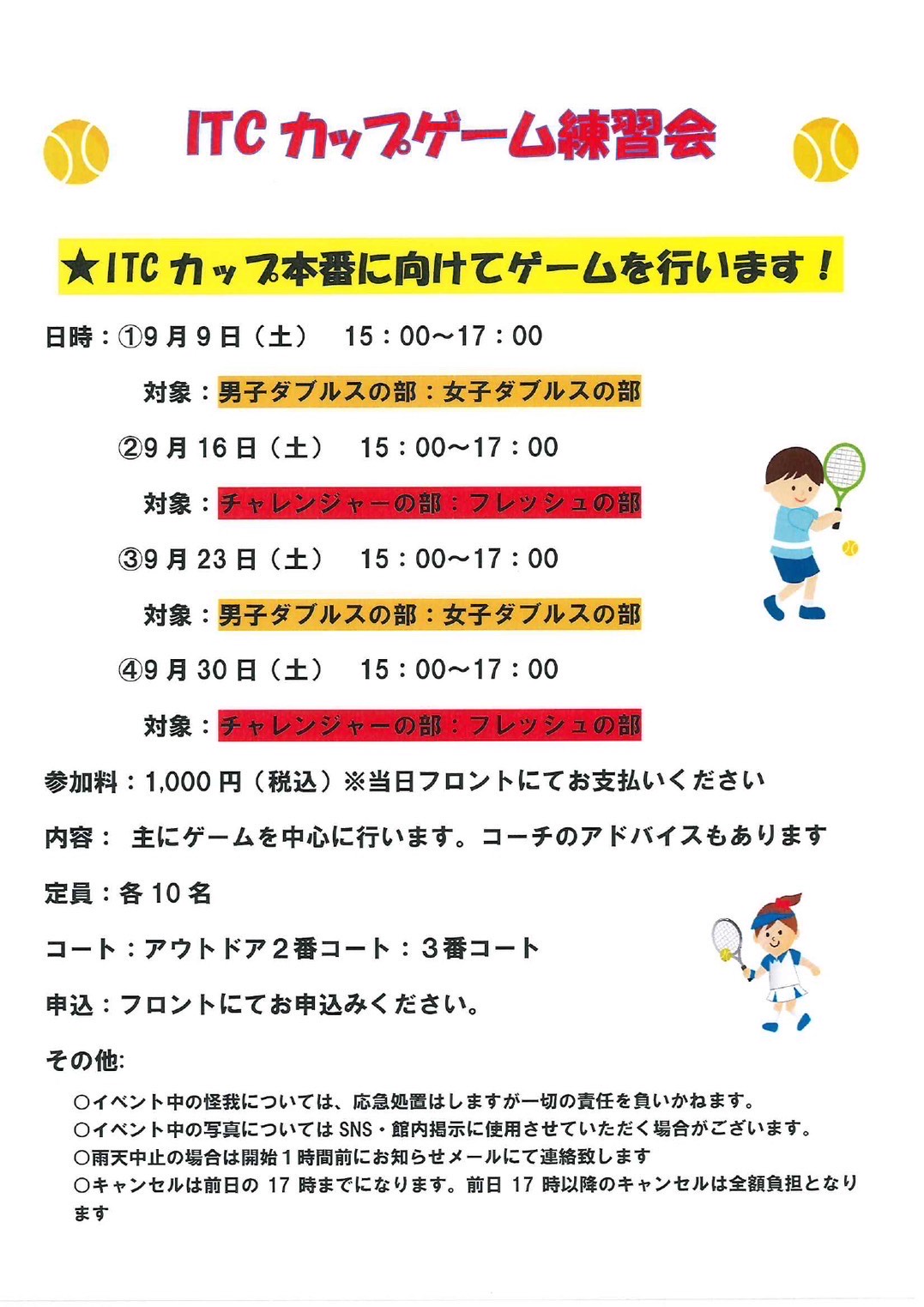 日頃の練習の成果を試す場として、またスクール生との交流を深める場として、是非ご参加ください🎾