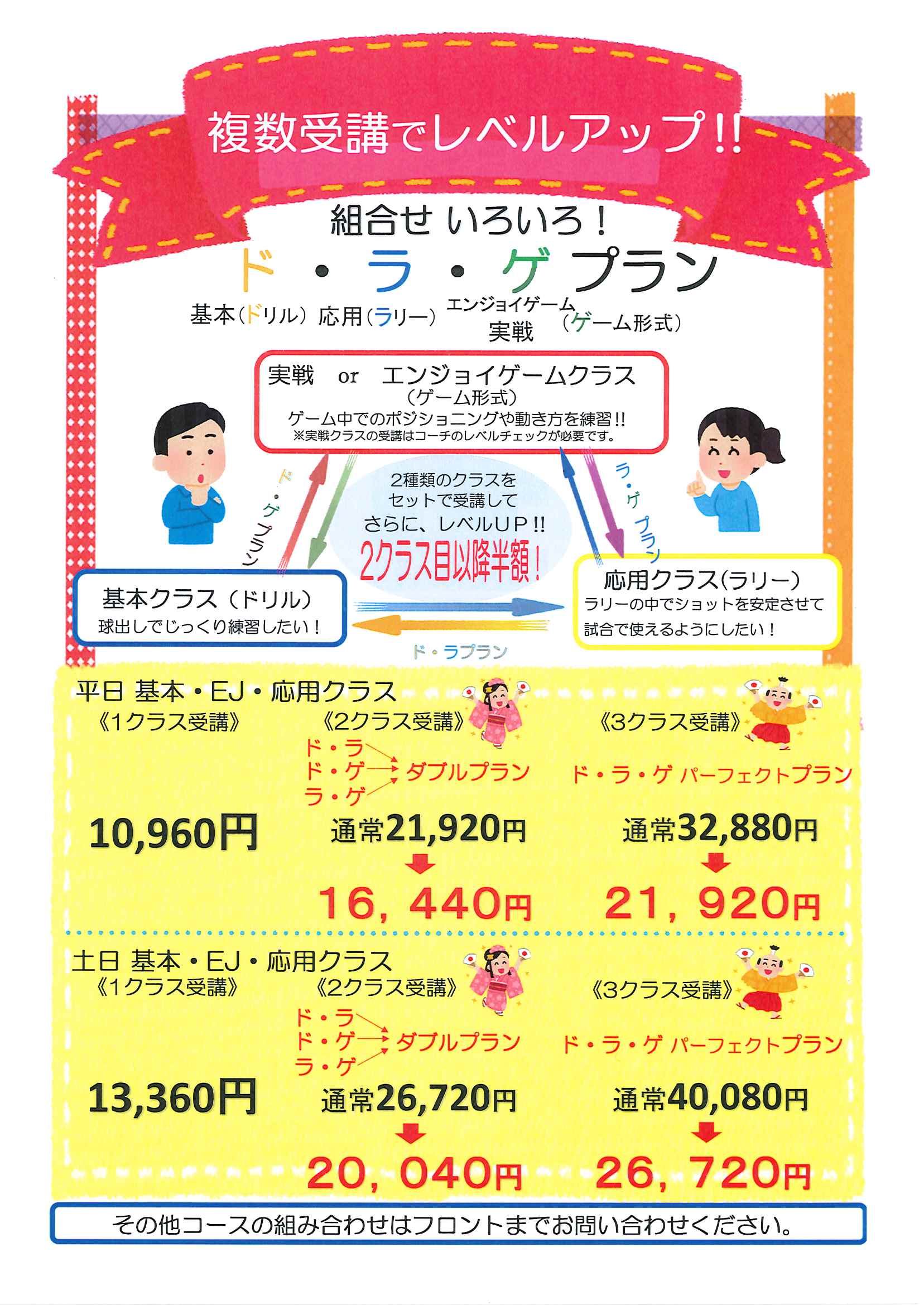 基本・応用・エンジョイ・実戦クラスの中で複数受講をすると、2クラス目以降の受講料が半額!!