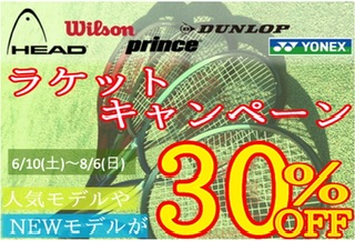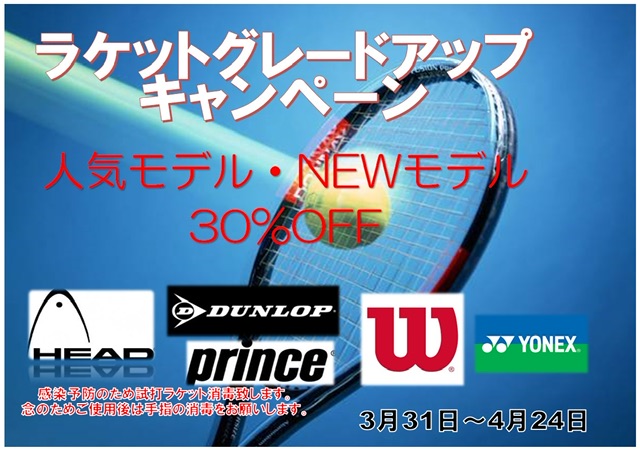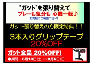 期間中ラケット購入、又はガット張替された方は3本入りグリップテープが20%でお買い求めいただけます。