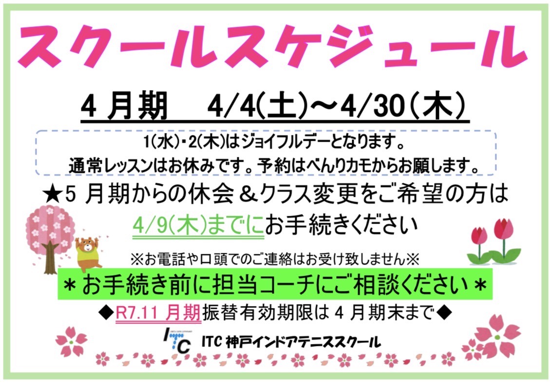 4月期のスクールスケジュール下記の通りご案内いたします。