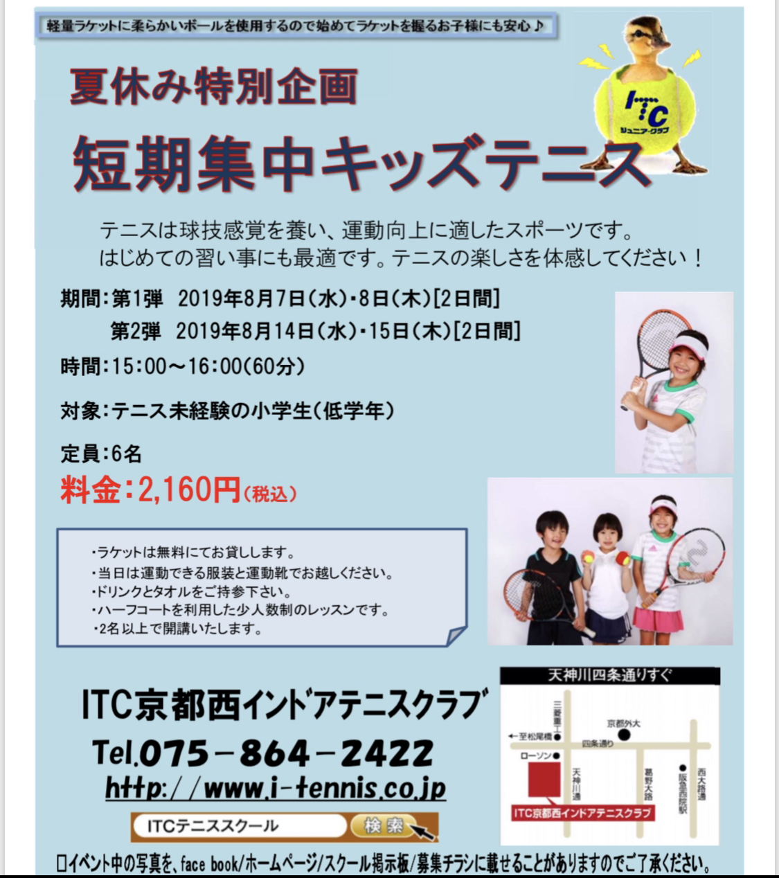 ITC京都西インドアテニスクラブでは、7月28日 日曜日に「夏のなかよし親子テニス教室」を開催します。