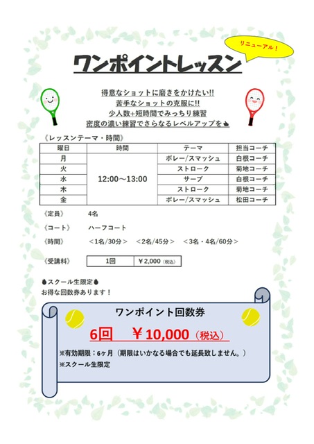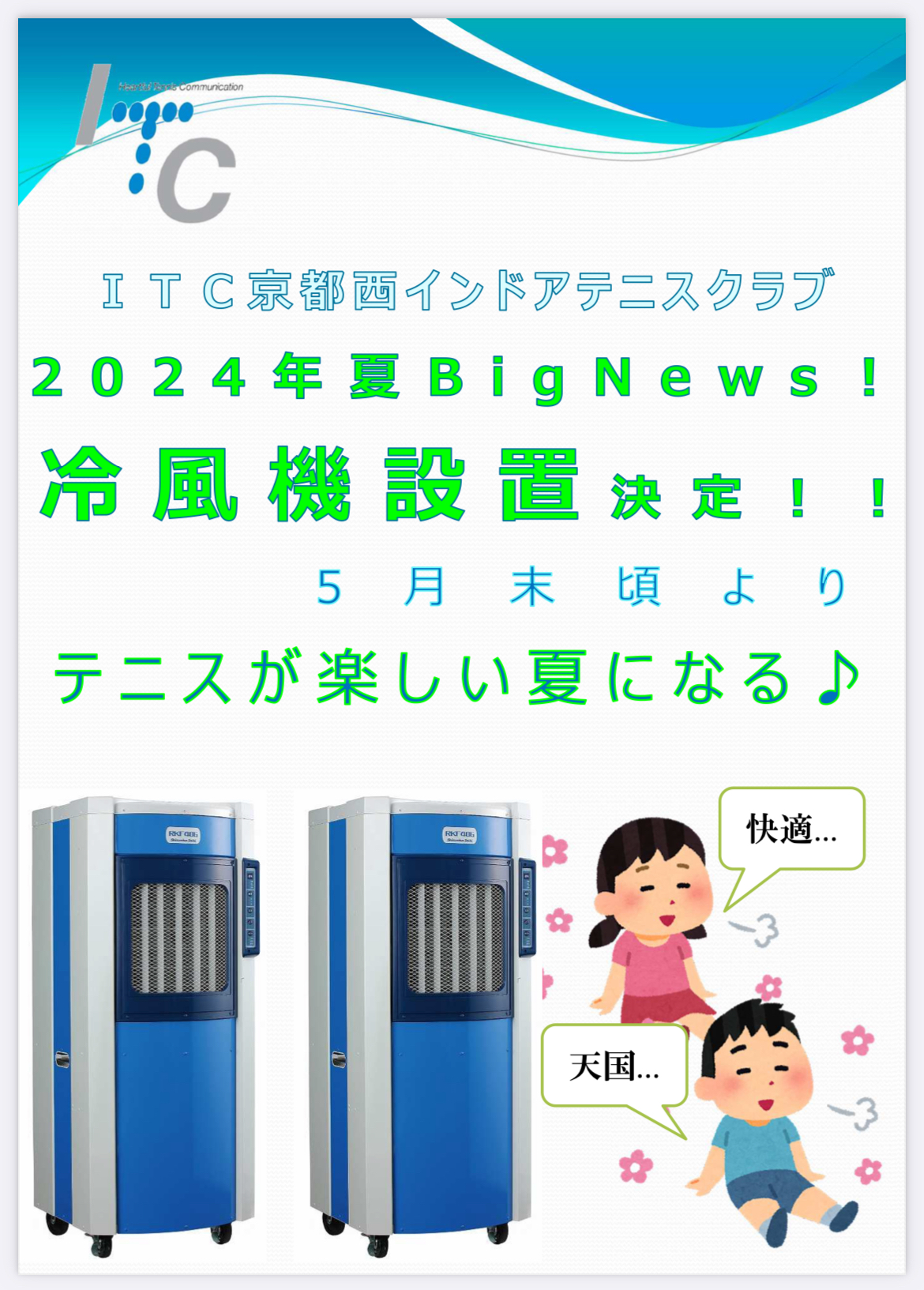 更に今年から『冷風機』を設置しますので、恒例の『冷凍おしぼり』『振替延長サービス』と共に無理せず少しでも快適にテニスを楽しんで頂ければと思います。