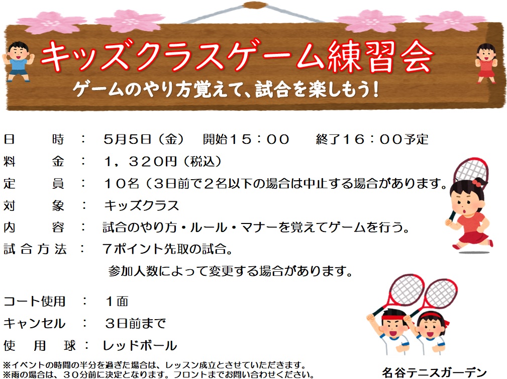 以前ご案内した「キッズゲーム練習会」「ジュニア・ジュニアマスター合同ゲーム練習会」は今週 5/5(金・祝)に開催予定です。