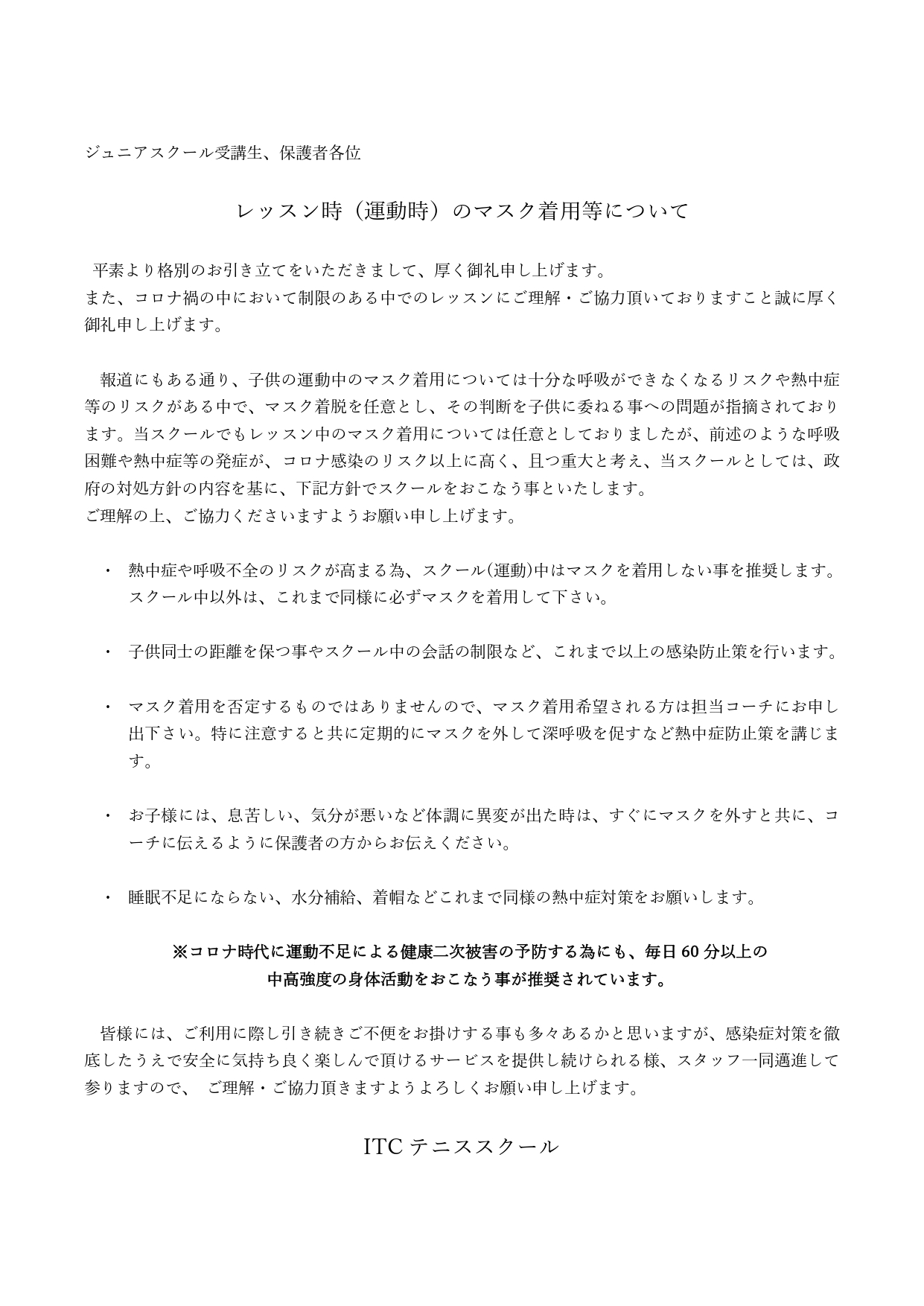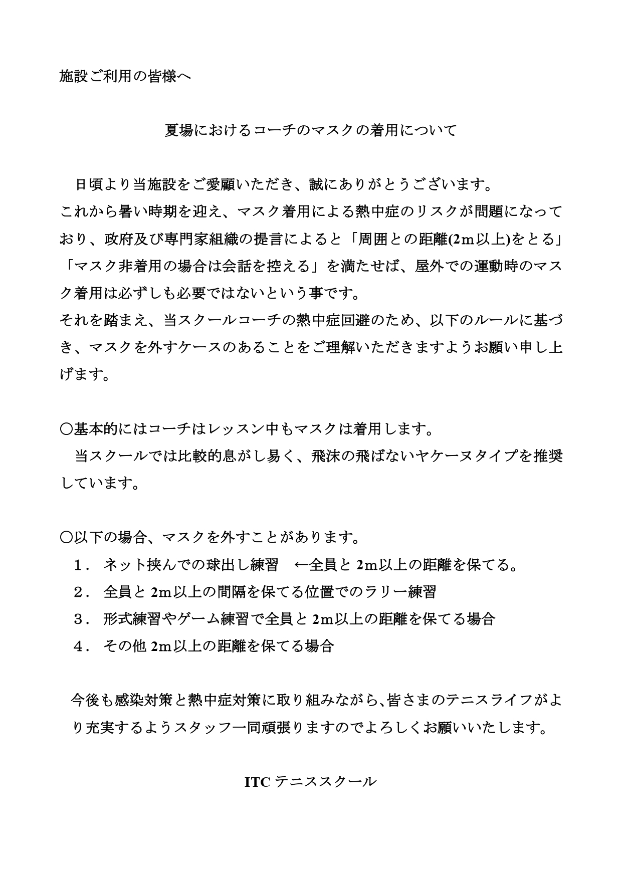 夏場のレッスンコーチマスク着用・ジュニアクラスマスク着用について
