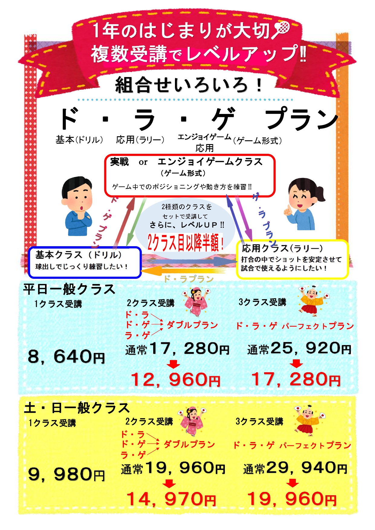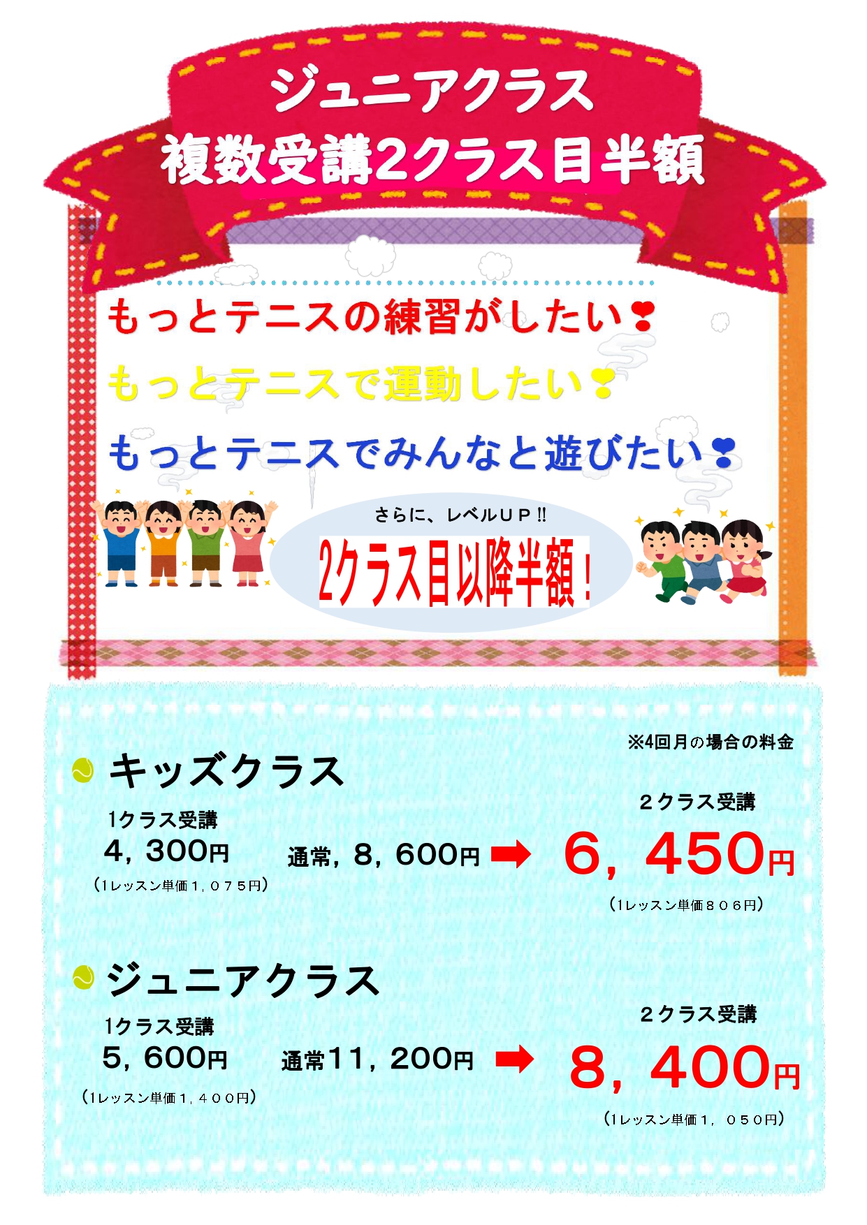名谷テニスガーデンでは、2クラス目以降受講料が半額となります。