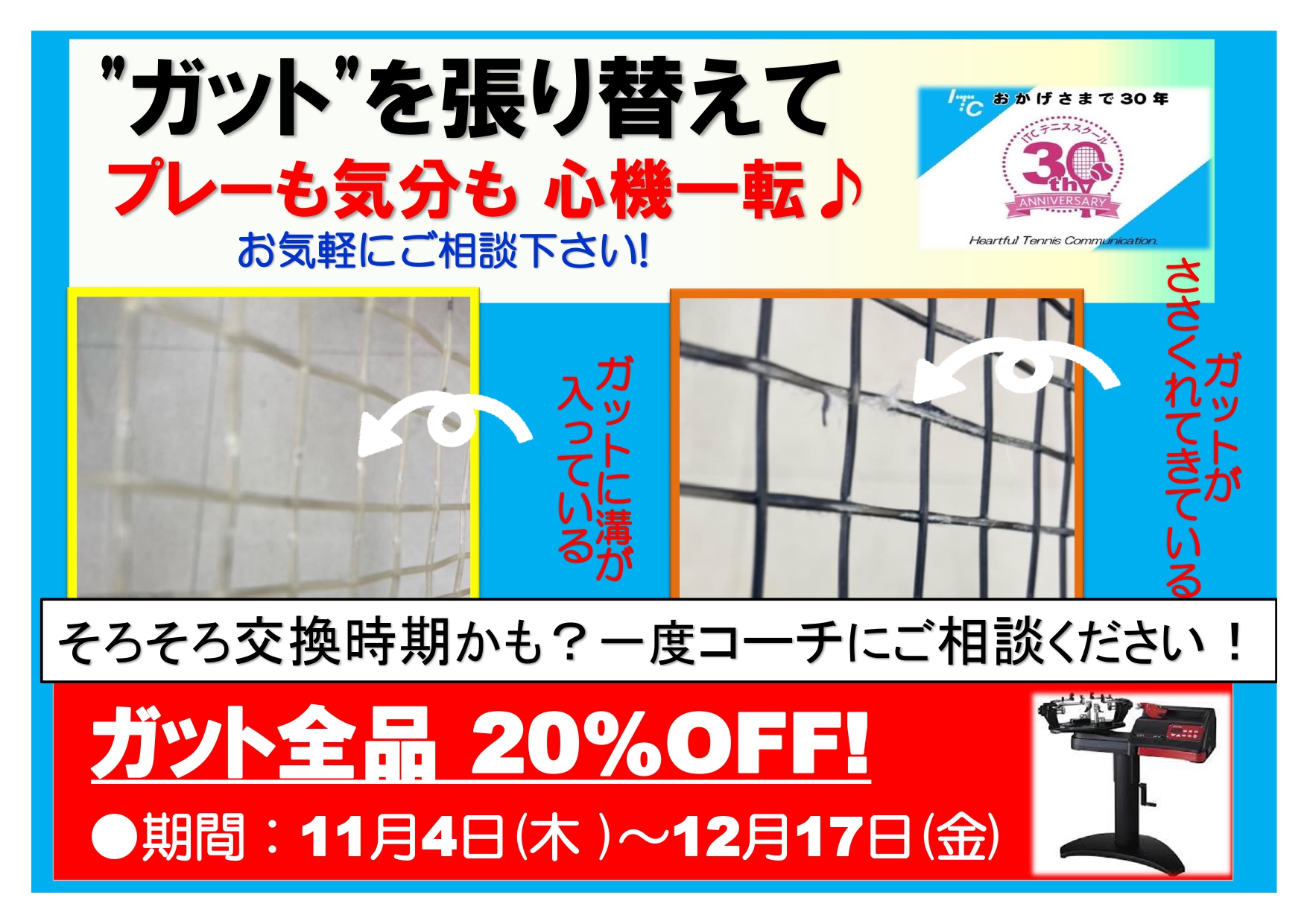 ガット張りキャンペーンもそろそろ中盤にかかりました。