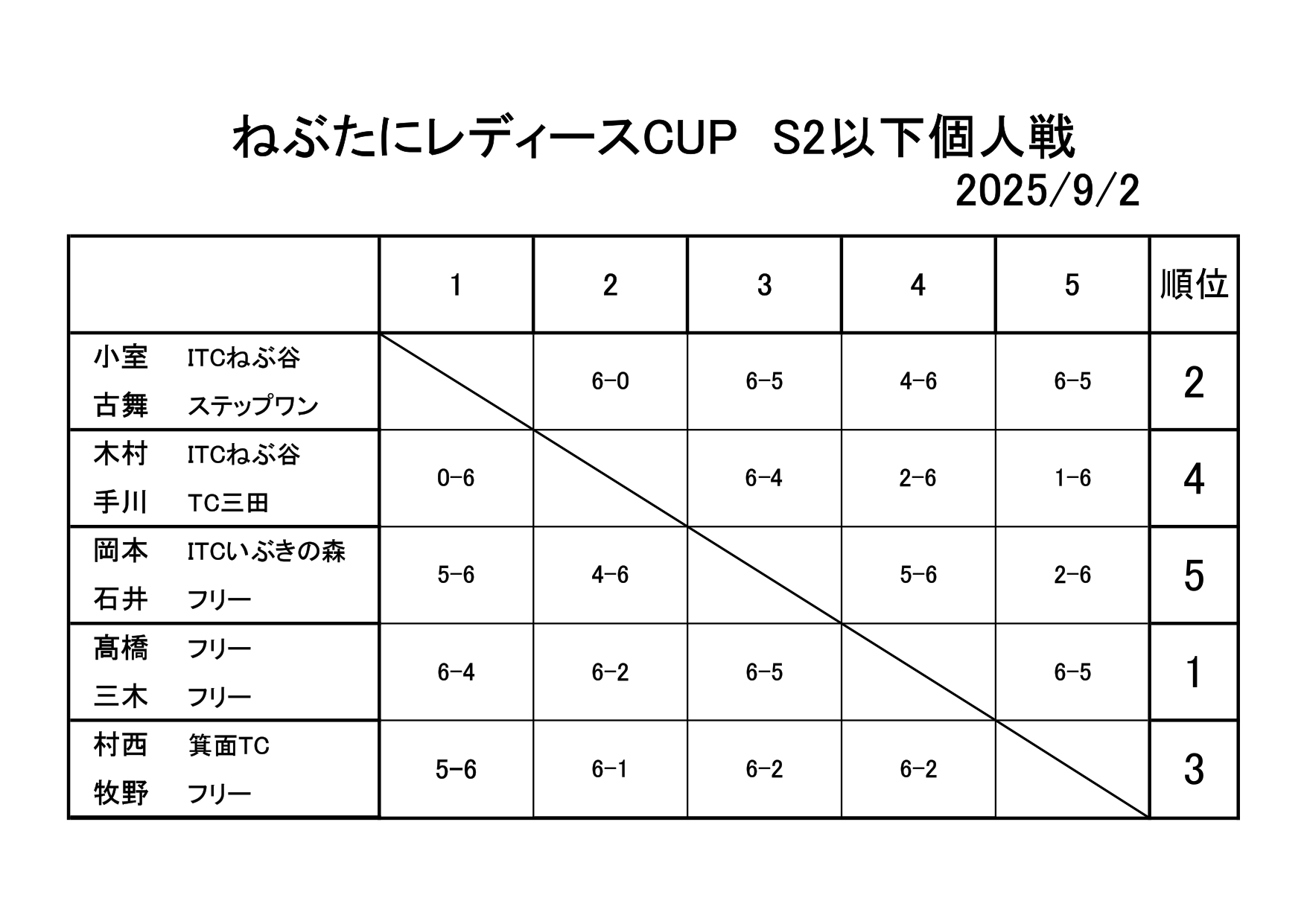 5組のペアにより熱戦が繰り広げられました。皆さまたいへんお疲れ様でした