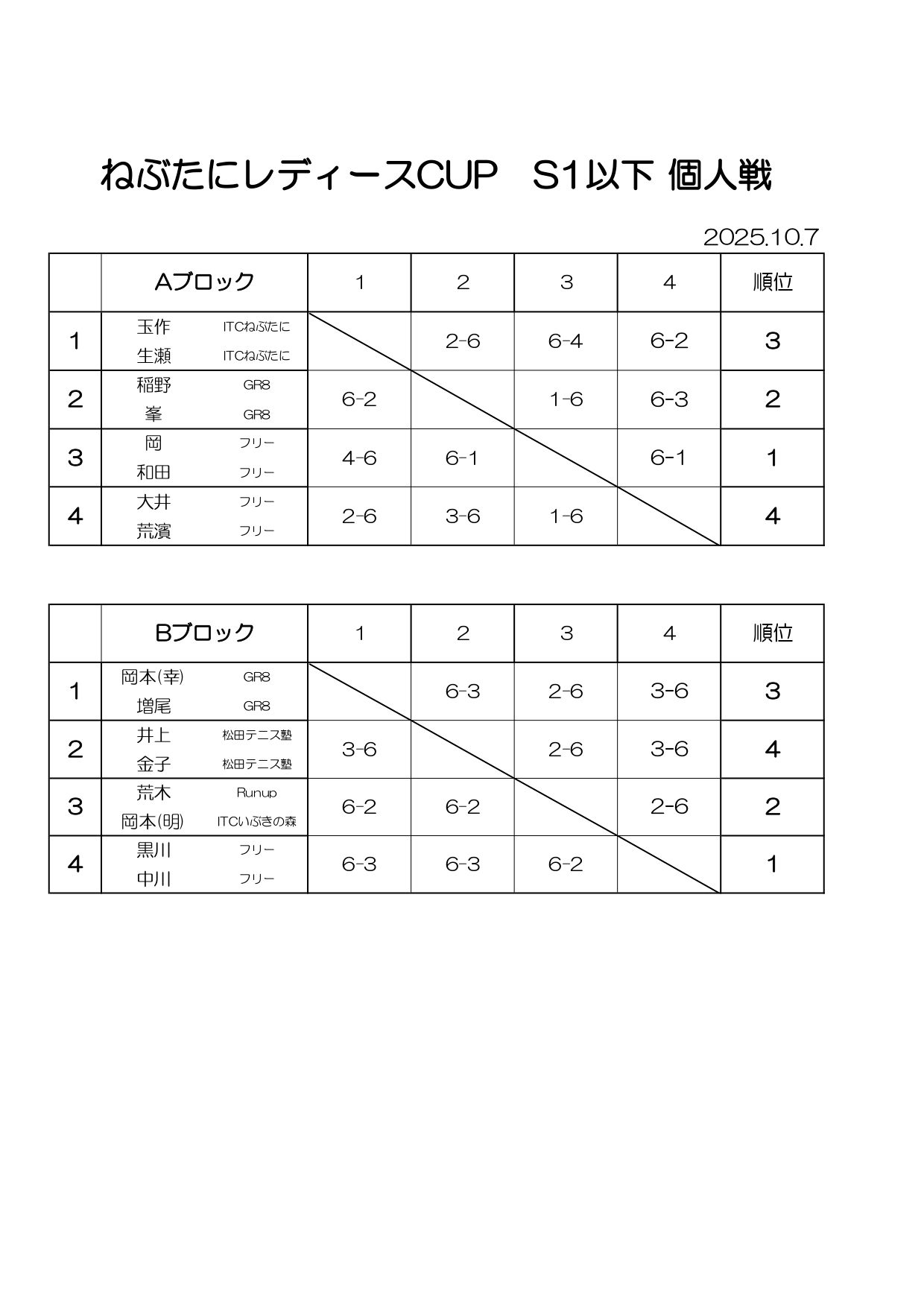 10/7(火)ねぶ谷レディースカップ S1個人戦を開催しました