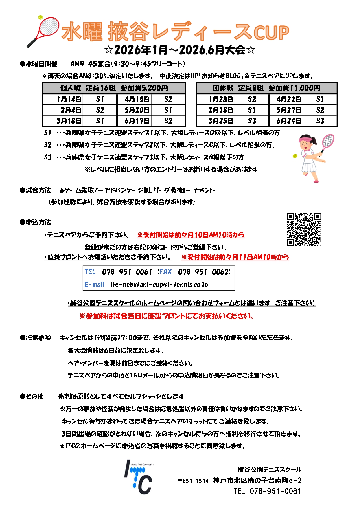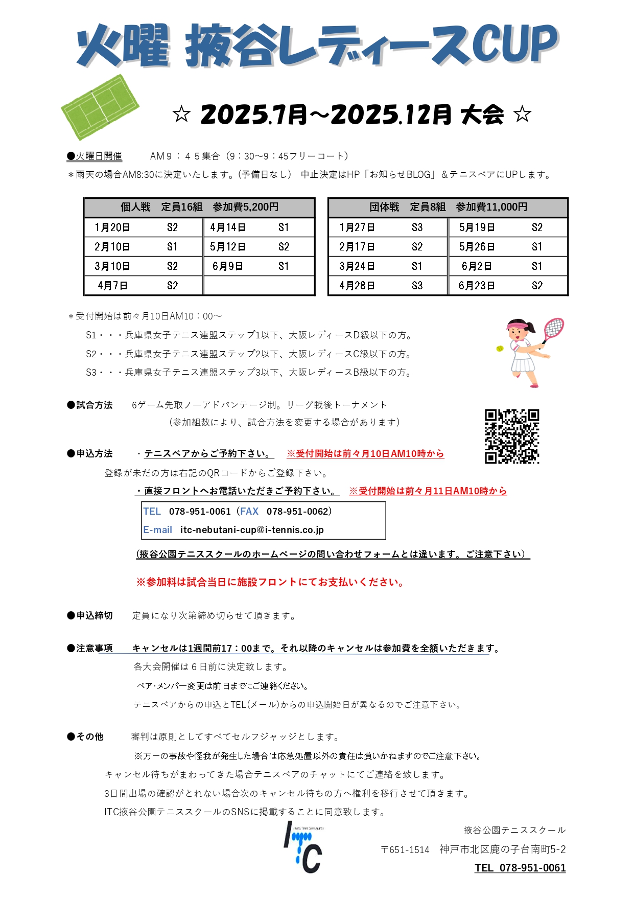 申 込 : テニスベア又はお電話(078-951-0061)又はフロント窓口