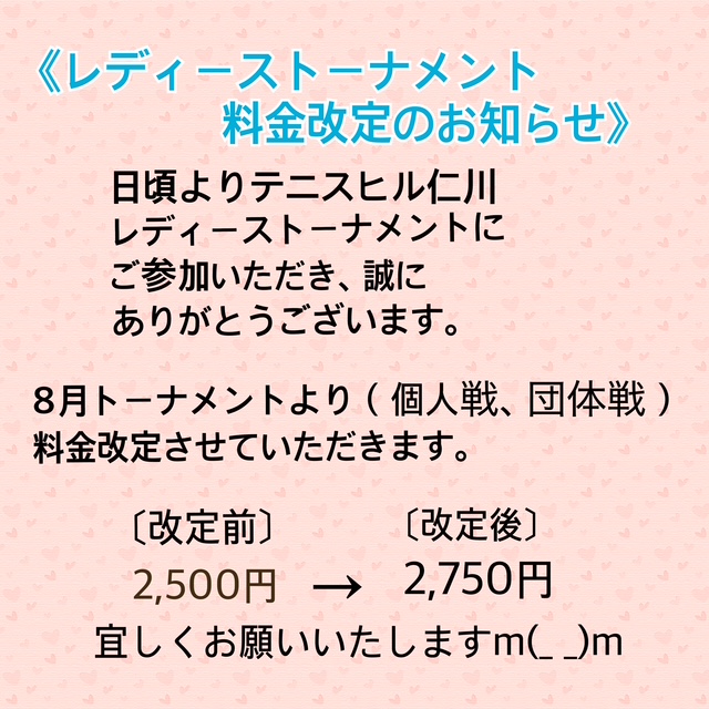 令和7年8月トーナメントより、料金改正致します。