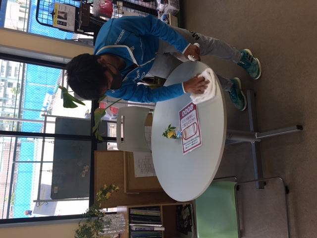 体調チェックシートを記入して頂いている机も、丁寧に