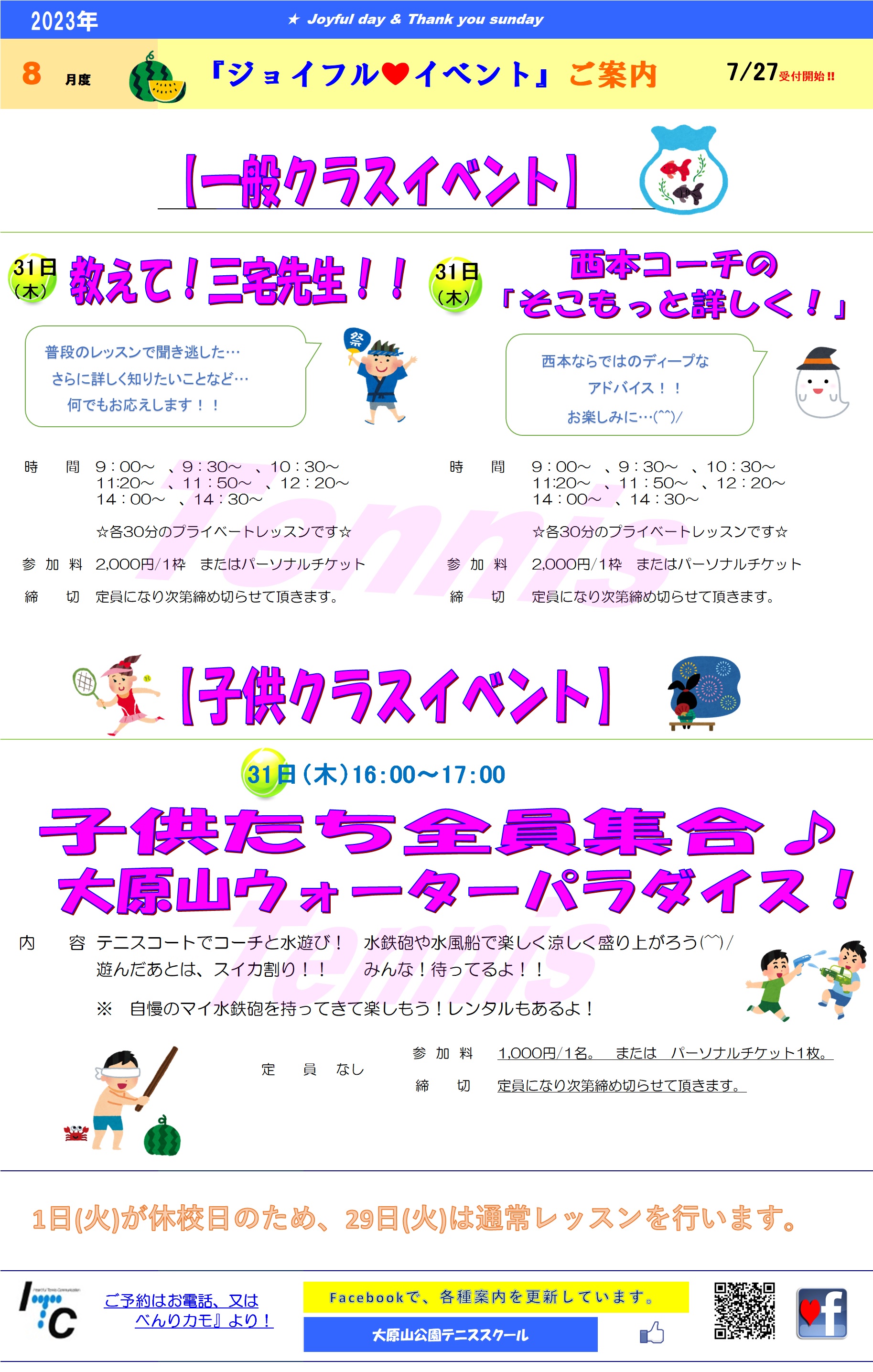一般クラスは三宅コーチ、西本コーチによるプライベートレッスンです。通常より時間延長でお得なこの機会に、是非ご体験ください