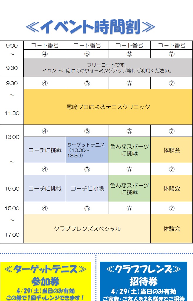 午後からも、「コーチに挑戦」「ターゲットテニス」「色んなスポーツに挑戦」「クラブフレンズスペシャル」と盛りだくさんで、一日中テニスを楽しんでいただけます