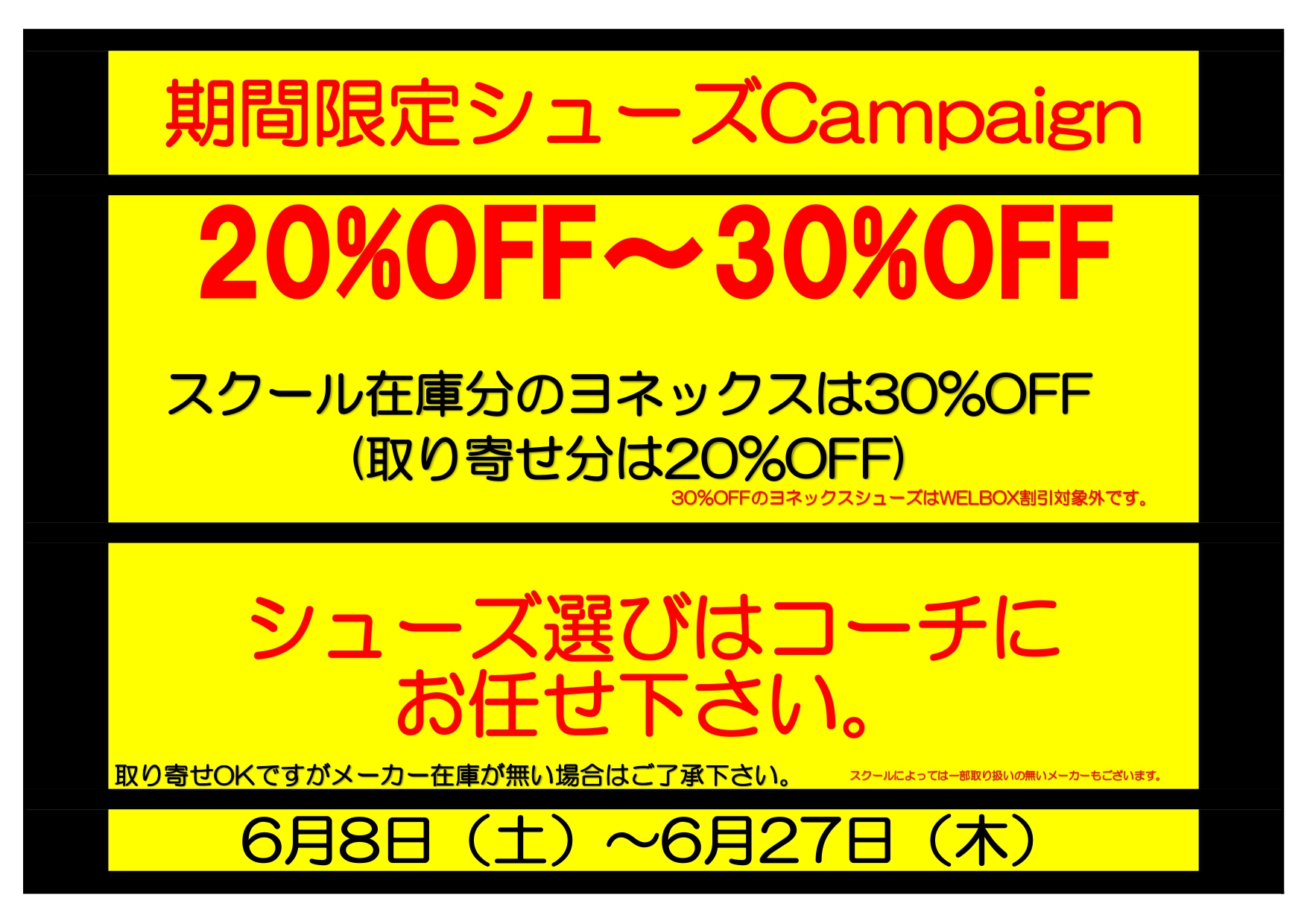 6/8(土)~6/27(木)の期間で【シューズキャンペーン】を行っています