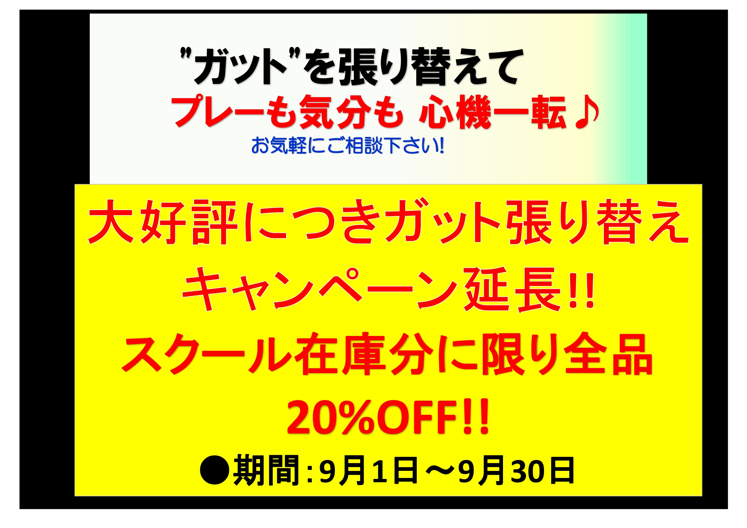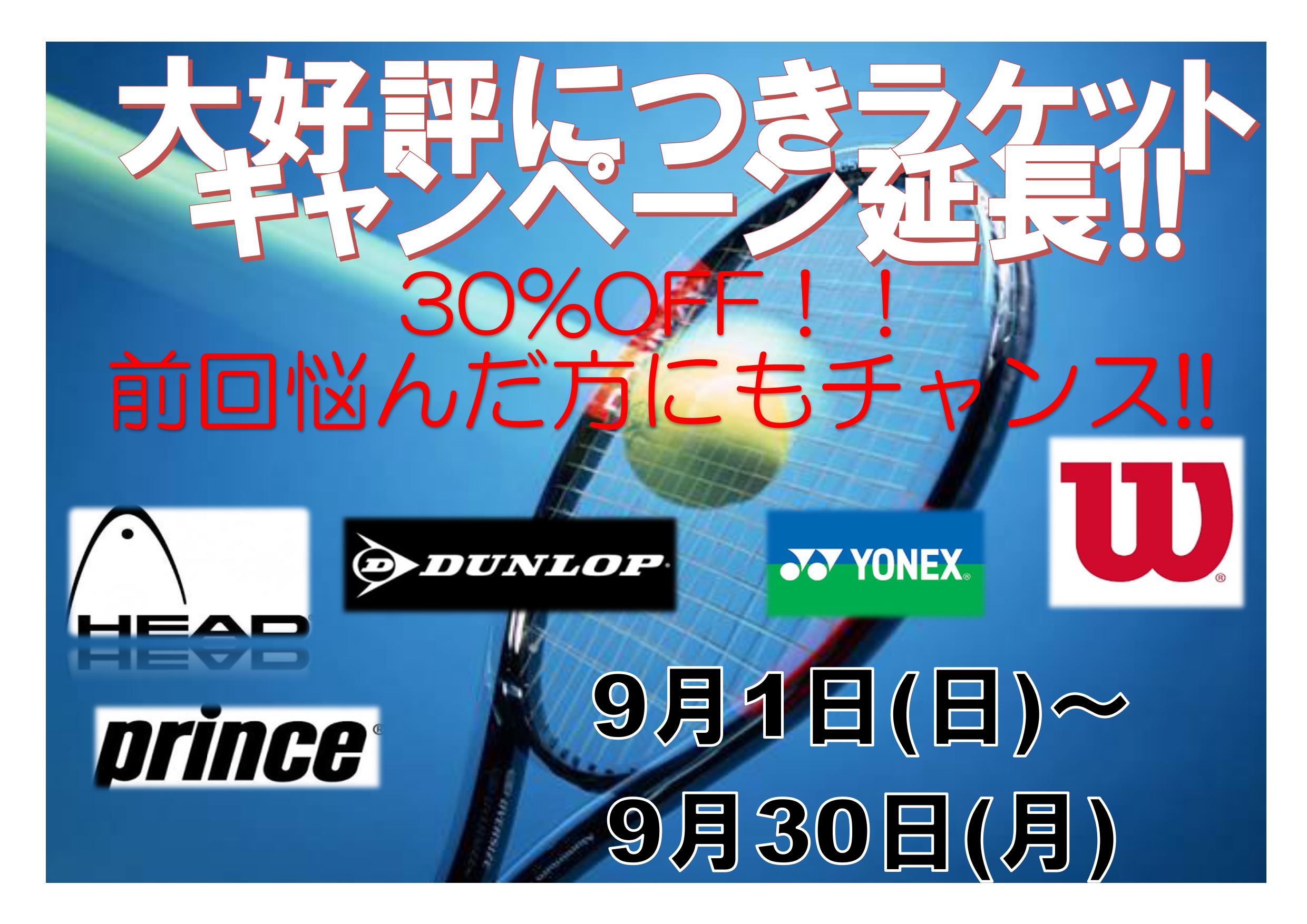 8月中旬まで開催してました、【ラケットキャンペーン】ですがこの度9月も開催することになりました!!